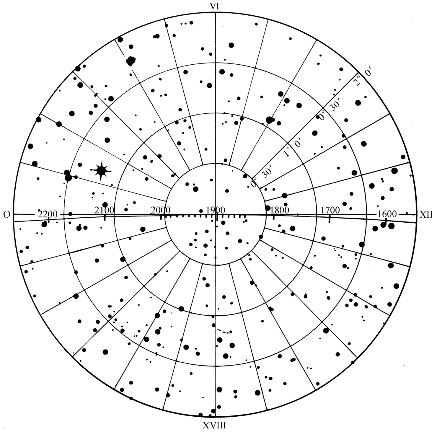 图62是北极附近大比例尺度的星图,它是1902年由弗拉马里翁天文台所绘的。图上的星至照相星等12等。我们很容易在图的左面认出小熊座α星。图上描绘了自1600年至2200年极点的运动,因章动的缘故,极点的行径本应是一条波形的曲线,但是按照我们图上所用的比例尺,这曲线的波幅不过是十分之几毫米,很难表现在图上。1930年前后,北天极很接近一颗11等星,在那几年里,它真可算是最近北天极的星了。但是,现在的北天极正以每年20秒的速率离开这颗星而去。