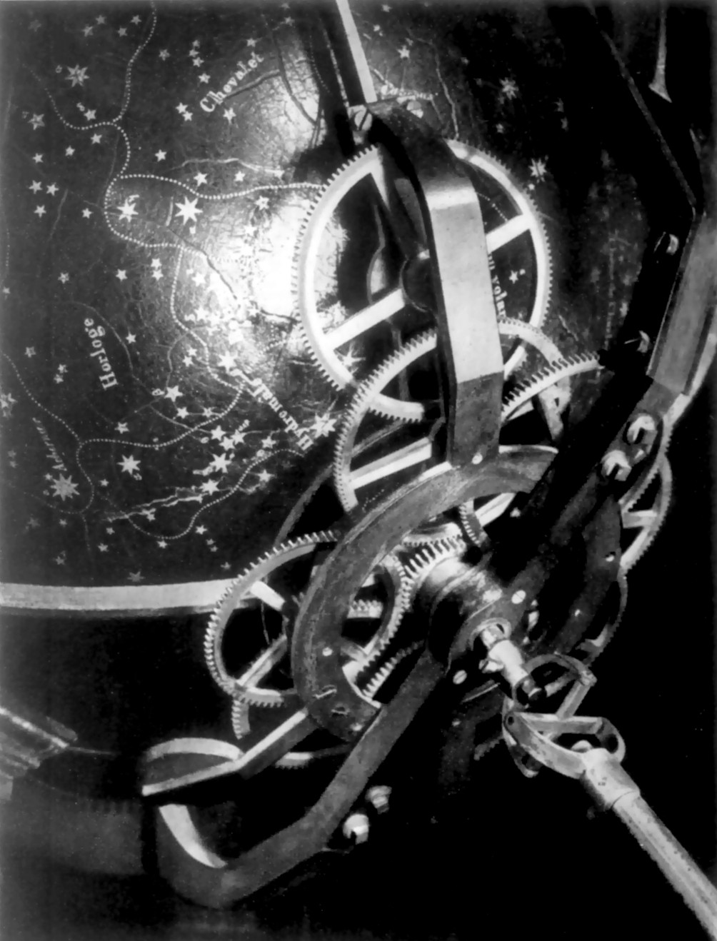 这座大钟表现了二分点的岁差,因而表现了天极在恒星间的长期运动。图右下方的司动杆支持天球仪的衔铁,使它在一恒星日内转一周。这天球仪还随衔铁围绕黄极转动,在9 451 512 恒星日内转动一周。图中的八对减速齿轮使这天球仪得到这样缓慢的运动。