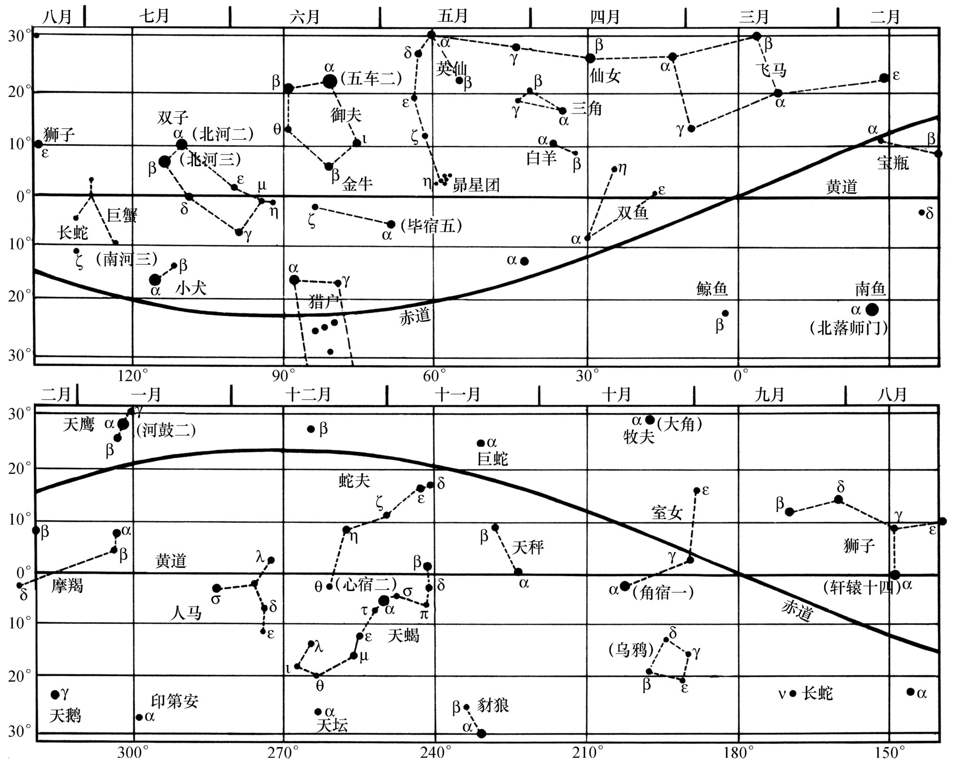 这幅星图和下面一幅星图是用黄道坐标,而不是用赤道坐标来表示的。图中正弦式的曲线代表天赤道的现在位置。
