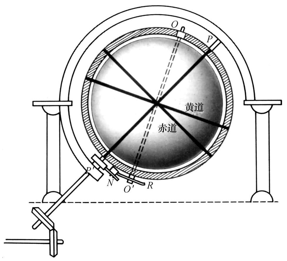 赤极轴是PP ′,黄极轴是OO ′,R代表减速的齿轮,为明晰起见,图上只绘了一个齿轮。
