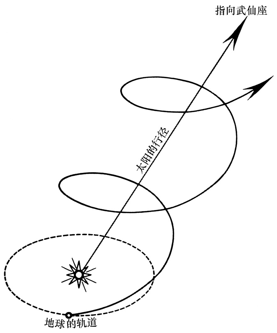 每一颗行星,特别是地球,同时还在环绕太阳的轨道上运动。这两种独立运动的组合,造成了一种螺旋式的轨道。