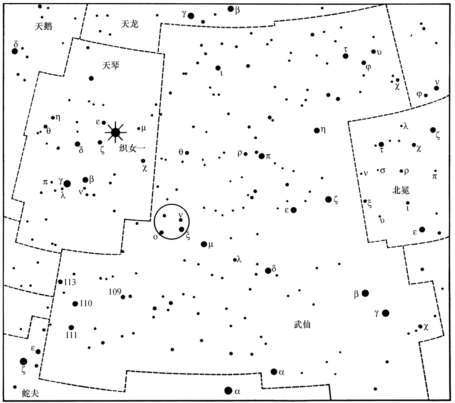 在织女星和北冕座之间(图75),你可以认出一些3等和4等的星,它们都属于武仙座,这便是在天空中我们长途旅行所奔赴的区域了。