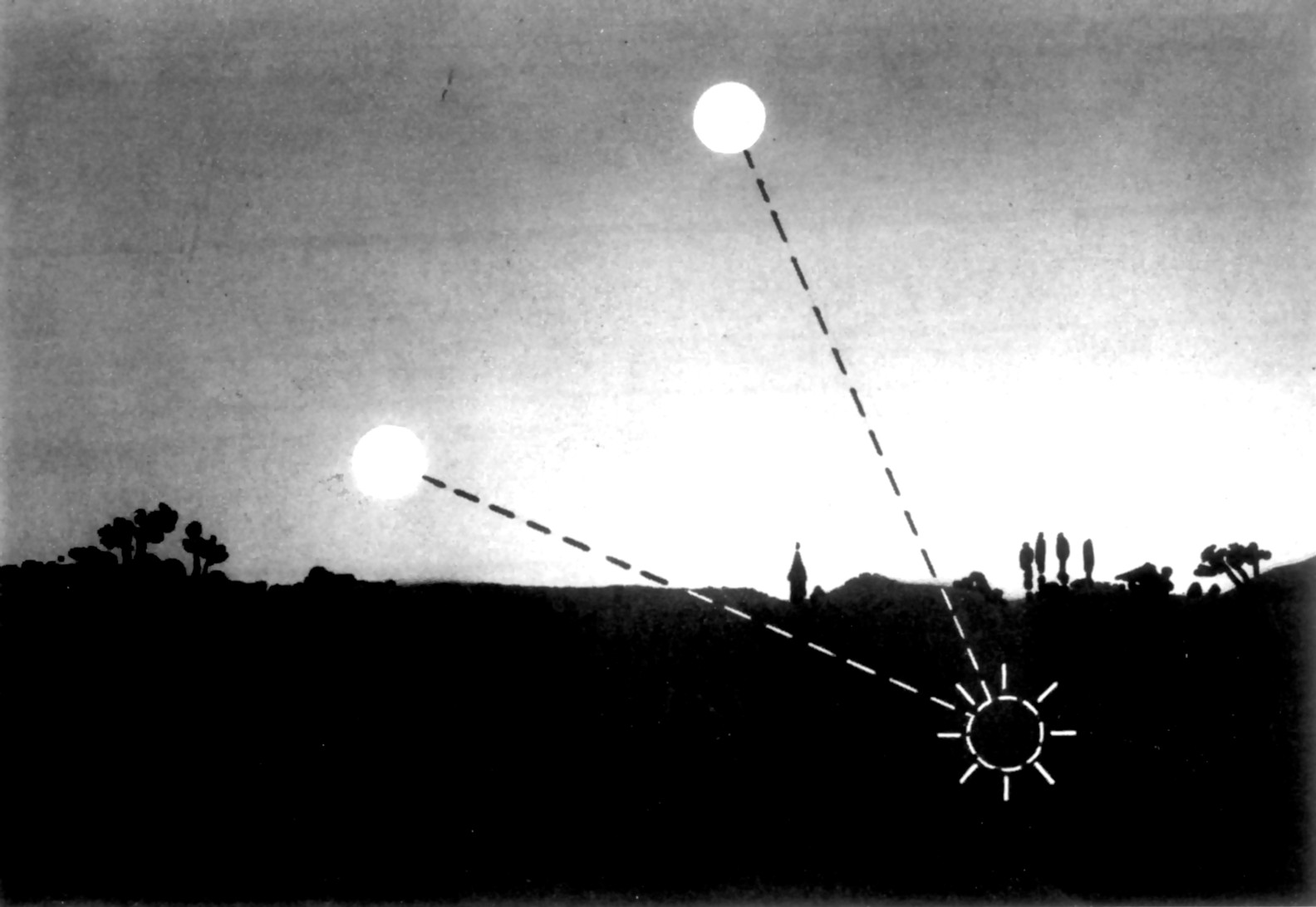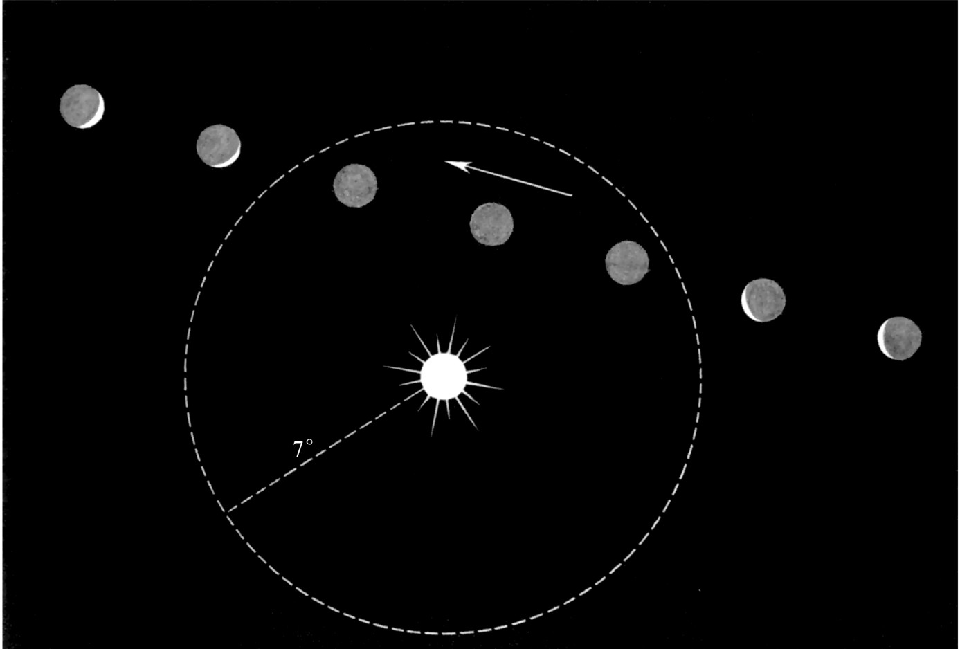 图136表示朔日前后月轮的连续几种情况。假设在新月的时候,月轮在日轮的北面(从我们的纬度看去,月轮在上)。它的一丝娥眉总把凸面向着太阳,但是到了合朔的时候,这一丝娥眉的光辉也完全消逝,即使那时并无日食。事实上,月亮表面的凹凸起伏很大,环形山的棱脊和高山的峰巅侧影互相重叠,使得月面向太阳的一些部分不能被人看见。这现象在弦角上尤其显著,因为在月轮周围,娥眉月占去的部分不及一半,弦角好像被剪裁过了。当月亮距离太阳20°时,因月面凹凸起伏的效果,娥眉的弧度减少了12°,可见的弧只有168°;距离太阳15°时,可见的弧只有142°;在离太阳9°处,娥眉的开口不过88°,还不到一个直角;在离太阳7°处,它就完全消逝,月亮的被日光直接照着的部分在地上就丝毫也不能够被看见了。