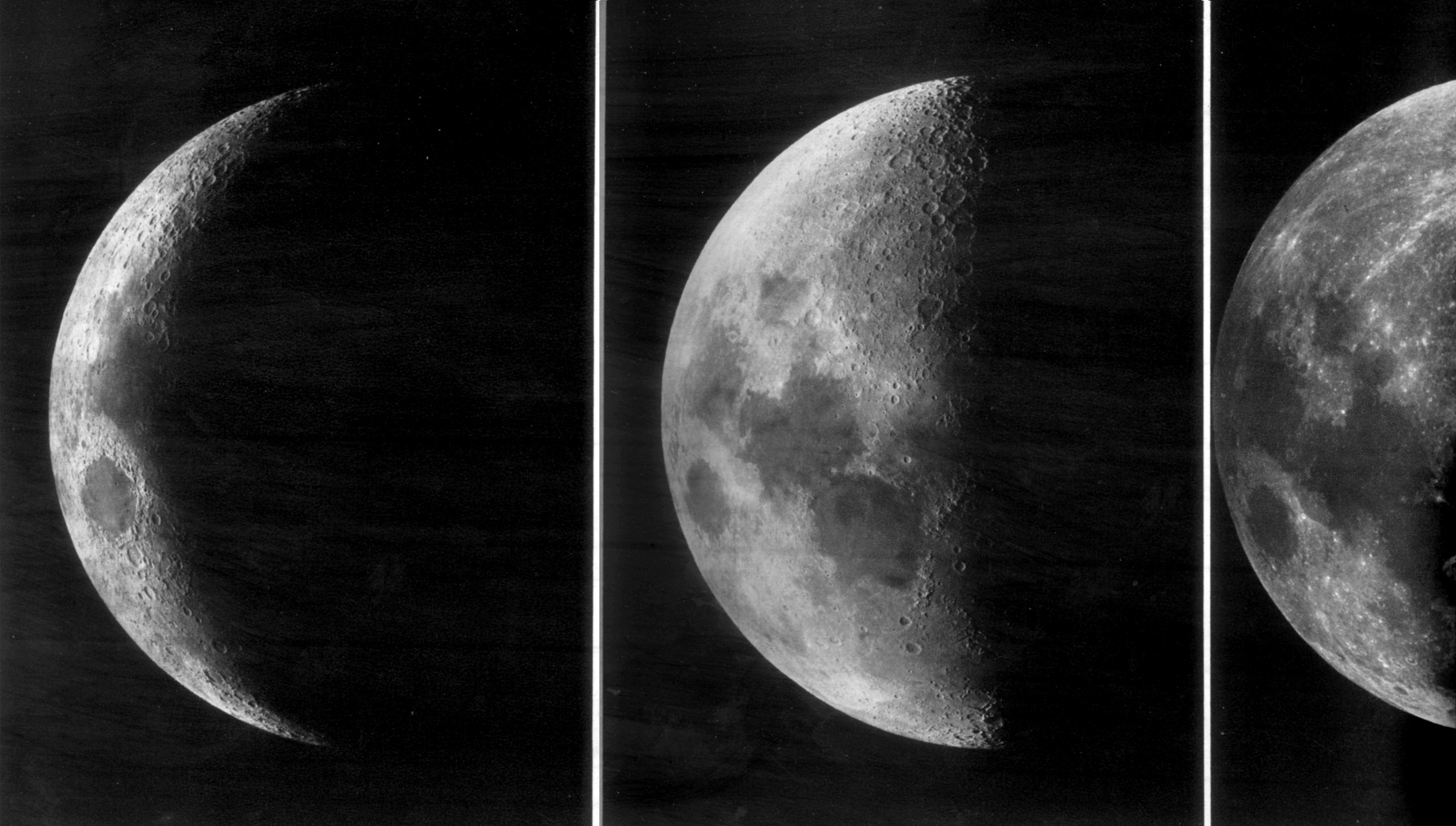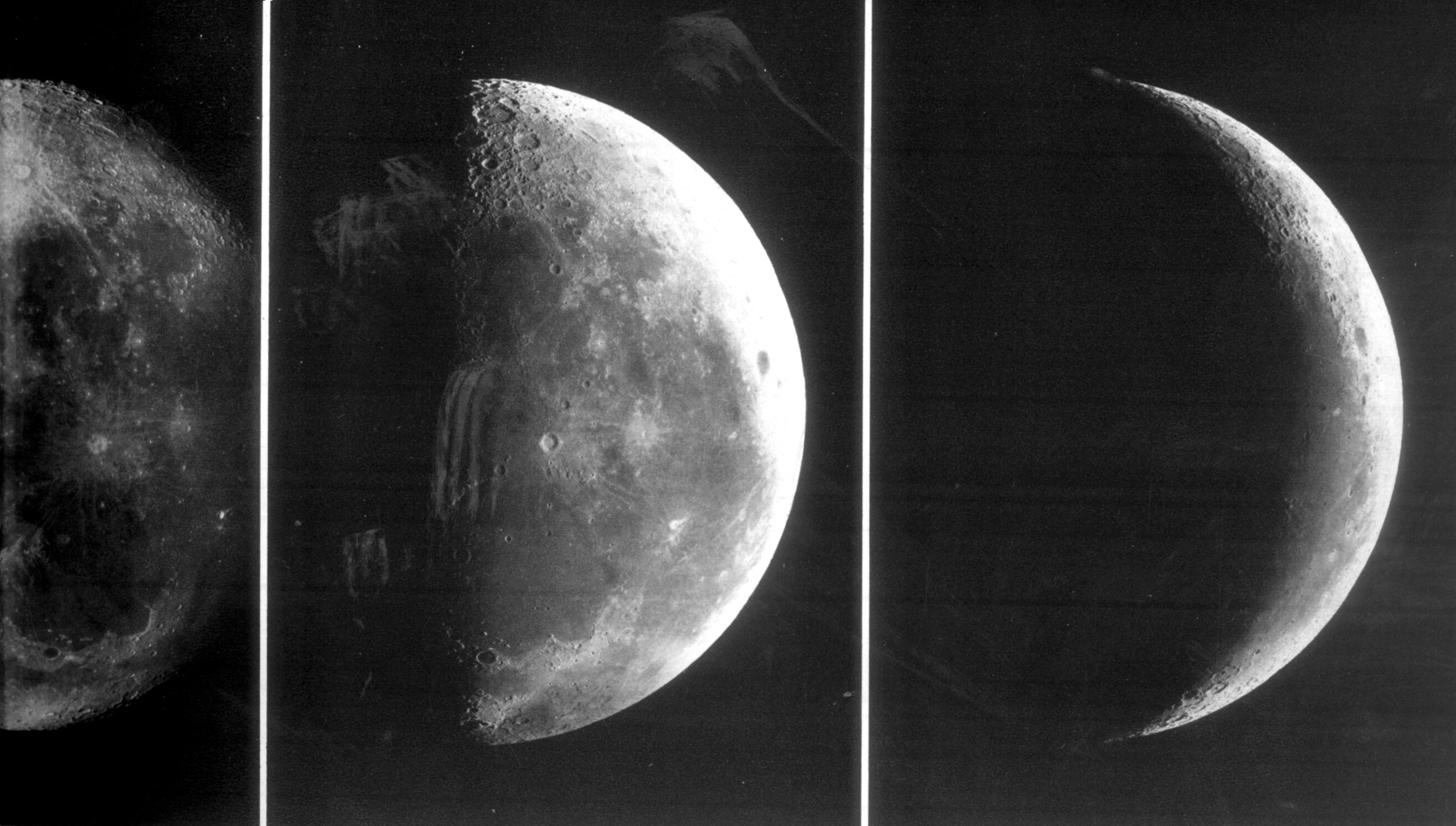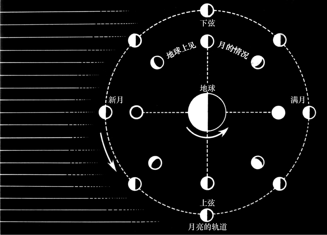 人类先注意到月相,然后才察觉到它在恒星间的运动。月亮在某一夜从太阳的光辉里诞生,那便是初生的新月〔又叫作朔〕。和太阳相合的第二夜,月亮呈现一丝娥眉的光辉,它的凸面常向着落日的一面〔许多画家没有注意到这个事实,常常把这个现象的方向画反了!〕。娥眉月逐渐长大起来,五六天以后它成了半圆的形状,明暗部分的界限似乎成了一条直线,那时叫作 上弦 ,在白天也容易看见。它继续离开太阳,成了卵形,又经过七天,光辉不断增加,以至满轮发光,通宵照耀,便到了 满月 〔又叫作望〕。那时它半夜中天,太阳东升,月亮西落。对于我们说来,这种现象说明月亮和太阳处在相反的方向,而且说明太阳是迎面地而不是侧面地照着月亮,我们才看见它的整个明亮的圆轮。