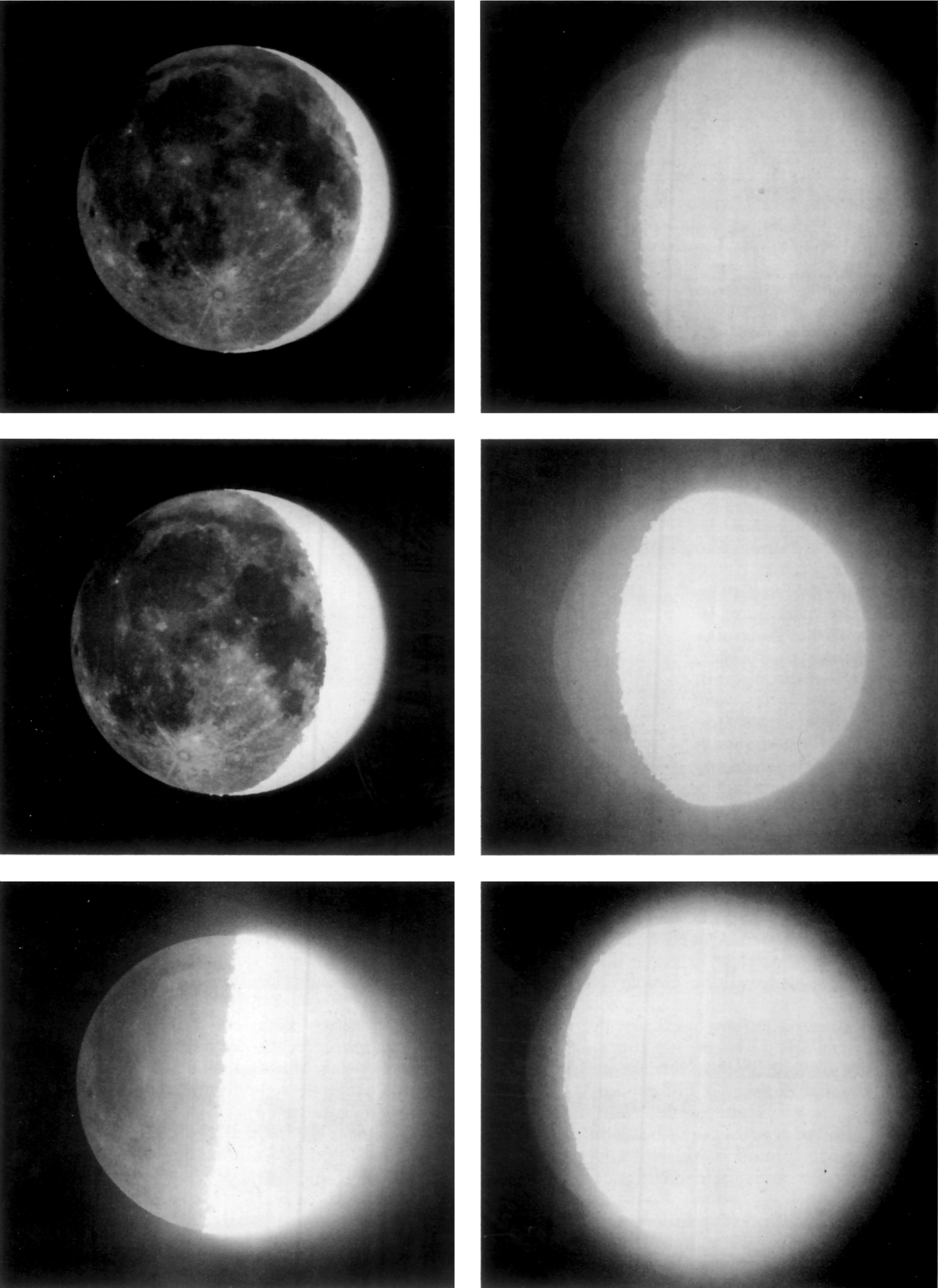 月龄开始的头几天,当月亮还是娥眉形状的时候,我们仍然可以看见月轮上其余部分还显现着暗淡的光辉(图138、图139),这便是 灰光 。这种光线的来源是由于地球的反射,因地球把照在它上面的日光散射在空间。对于我们来说,月亮和太阳是朔的时候,对于月亮来说,地球和太阳是望,在月亮上看地球,那时地球是一个圆轮。地球反射给月亮的光辉约为满月反射给地球光辉的45倍。