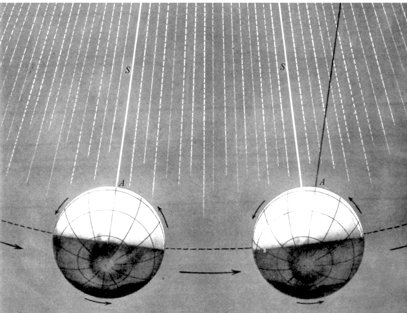 只要我们想到地球不但绕着自己的轴转动,而且绕着太阳在运行,那么地球自转的周期和太阳日的长短两者之间的差异就很容易解释了。设想在某一定时间地球在某一个位置上,它沿着一个轨道由左至右(图18)在一年内绕太阳转一周,同时,它又绕着自身沿箭头所指的方向一天转一周。设想在正午地A(左球)正面对着太阳,第二天当地球恰好转了一周,它却到了右边那个位置,过A点的子午圈又来到恰在前一天的那个位置。但是地球的公转使它向右移,在地面上看去太阳似乎向左退后了,因此要使A点再来到太阳面前,使A点再处在正午,就需要使地球绕着自身再转3分56秒,这在一年内每天都是这样的。因此太阳日(或称
