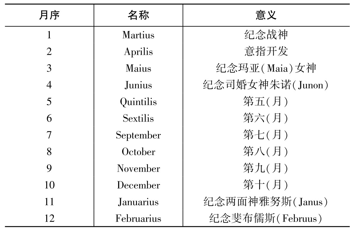 第一月是纪念罗马人的最高守护神战神,最后一月是纪念死者。五六两个月因尊重儒略·恺撒和奥古斯都两位皇帝,已改名叫作Julius和Augustus了。后来的罗马皇帝,如提比略(Tibère)、尼禄(Néron)和康茂德(Commode)都想把自己的名字改作以后的几个月的名称,然而没有成功。