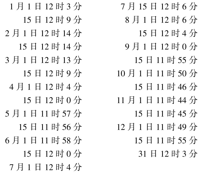 将恒星连续两次过子午圈与太阳连续两次过子午圈作比较,这两种时间的差别是3分56秒,但是这只是一个平均值,因为太阳的视运动比地球的自转更不规则。事实上,太阳每天的延迟在3 月末只有3分38秒,9月中是3分35秒,6月20日是4分9秒,而在12月23日却是4分26秒。太阳过子午圈,即日晷上所表示的 真正午 ,在任何连续两个真正午之间的时间并不是相等的。在9月16日、17日两天的两个真正午之间只有23时59分39秒,而在12月23日、24日两天的两个真正午之间却有24时0分30秒。
