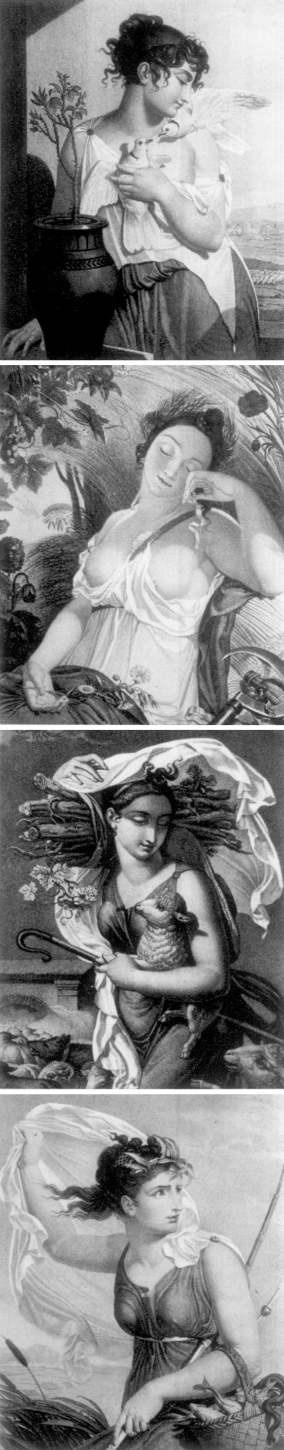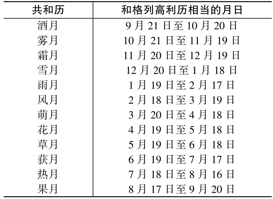 到了今天,原来的7月变成了我们的9月,8月变成10月,9月变成11月,10月变成12月,即最后的一月了。你想还有比这样安排月份的方法更荒唐的吗? 这一切的混乱,都是因为把岁首从春光明媚的3月移到一般说来是萧索愁苦的1月去的缘故。由此可见,现行的月的名称起源于罗马,既不是基督教国家的历法,也不合它原有的意义,因为它经过了颠倒错置,而且不与气候的变化相合。只有1789年法国大革命时代所颁布的共和历,才弥补了气候变化这一点。每一季度的三个月都有同样的语尾,都和气象或农业发生联系,真正做到音义均佳的程度。酒月是在收获葡萄的时候,霜月下霜,雨月多雨,萌月、花月、草月是代表在春季欢乐的太阳下跳舞的女神。下表记载共和历12个月和格列高利历相当的时期: