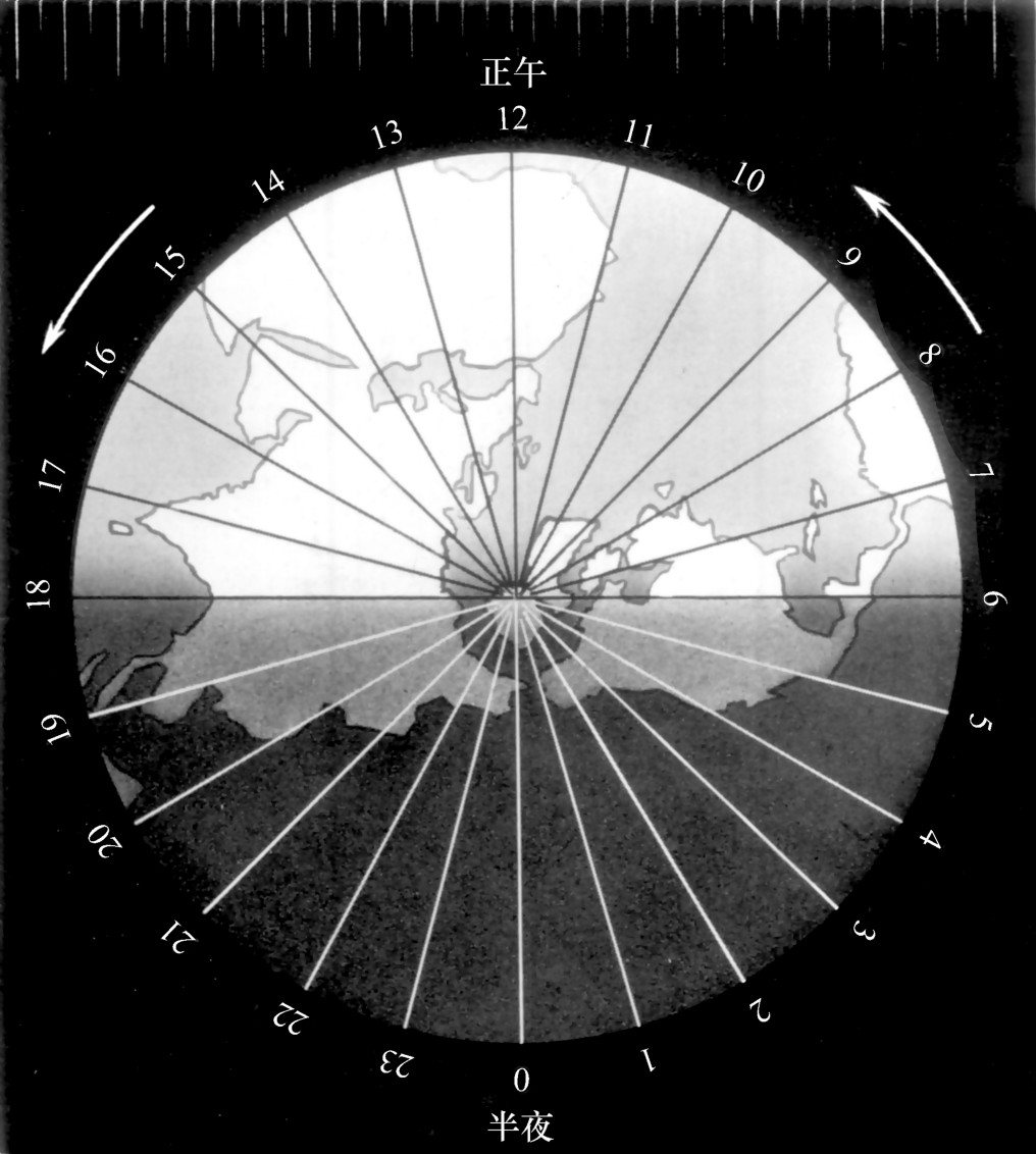 大家都看过 日晷 ,它可算是普及天文知识的一种工具。它利用在阳光下的一根杆的影子,大概地指出太阳时来。常见的一种日晷是建在可被日光照到的垂直的墙壁上,在其上描绘出代表时刻的线条,一根针影和这些线条重合的时候,便表示出时刻来(图10)。日晷的种类很多,可以建在任何垂直的、水平的或者倾斜的平面上,也可以绘在曲面上,其形式和位置都可以随便处理。只是应当满足一个条件:在白天,日晷的表面应该能接受到日光。如果在某一瞬间,人们可以同时读出全球的日晷所表达的时刻,就会立刻发现这些时刻是不相同的。有些农民常说的“ 太阳时 ”是随我们所在的位置不同而不同的。只要思考一下便会明白其中的缘故。因为地球的自转运动,地上的各处依次地落在光明或黑影里,即在白昼或黑夜里。在任何一个时候,一个地方是昼,总有另一个地方是夜。对整个地球来说,所有人从来没有在同一时刻睡眠;这半球在休息,那半球则在工作。当年英王查理五世曾夸耀他的领土宽广,号称自己的国家是“日不落帝国”。