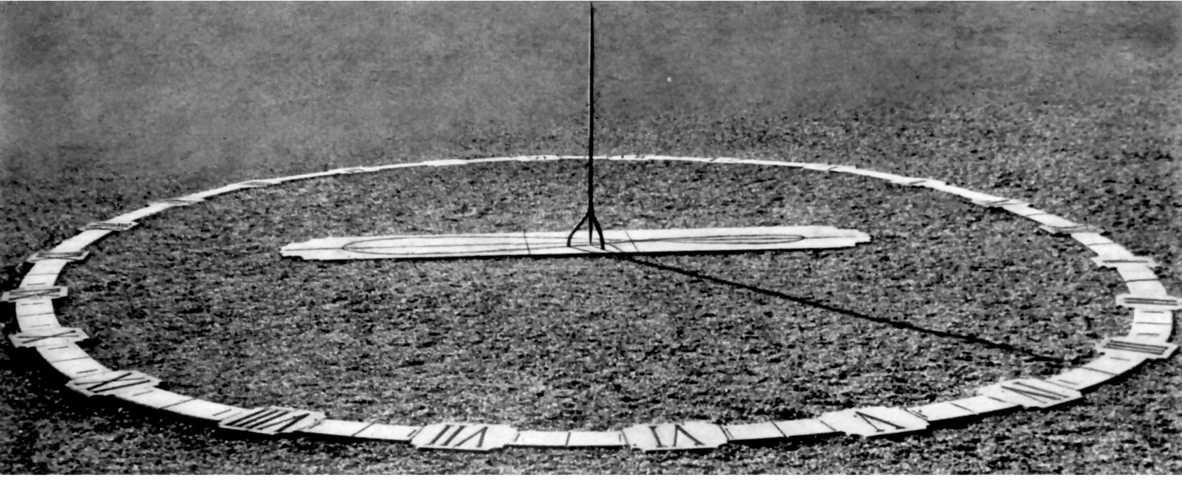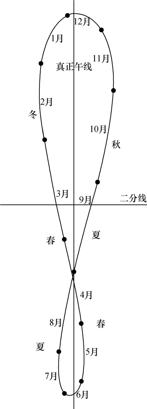 在有些日晷上附有一种装置,可借此直接读出民用时来。常用的一种装置是在固定的日晷上给出一根曲线,可从这根曲线上读出每天中午的民用时。这根曲线叫作 平时的子午线 ,形状像一个拉长的8字,每天一到民用的中午(即时钟上是12点),指针的末端便投影在这根曲线上。因此,观看针影经过这根曲线而得民用时的中午,正和观看针影经过子午线而得真正中午一样容易。