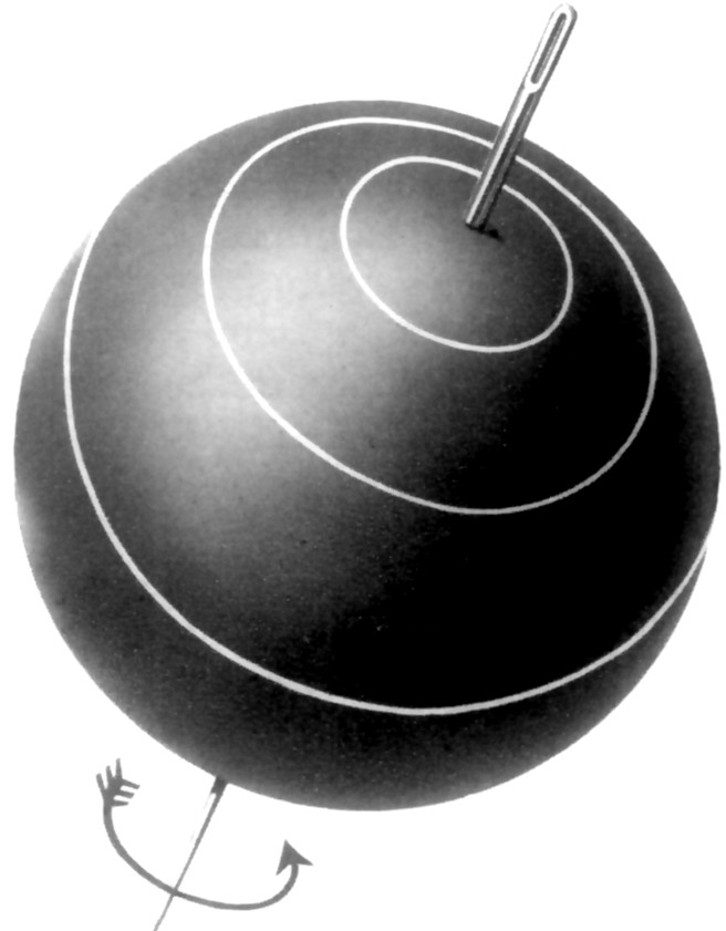 假设用一个被一根针贯穿的球(图11)来代表地球,再假设我们用手指使这根针转动,这根针就代表地球的 旋转轴 ,球面和针相交的两点,就代表 地球的两极 。这两个基本观点,想来读者是容易记住的。现在我们就明白了所谓 地轴 就是穿过地心的理想的直线,自转就是绕着它在进行;我们也明白了什么是两极。把这个球的北极对着我们,并使这个球按照地球旋转的方向那样旋转(使它按逆时针方向转动),你就可以知道,地球的自转是带着我们 由西向东 转动。