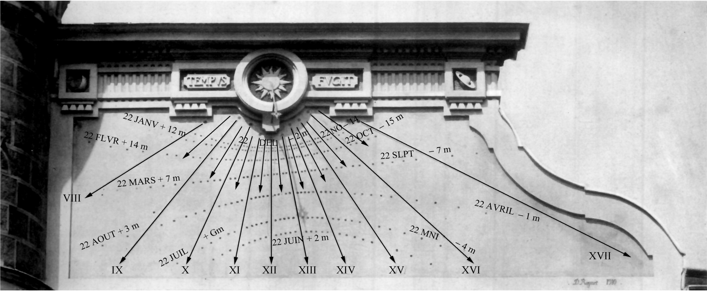 日晷的形状很多,有些很是奇特。有一种名叫人影晷,观测者站在相应的日子点上,他自身的影子便指出当时的时刻。法国安省(Ain)某教堂内以及第戎(Dijon)和阿维尼翁(Avignon)两城各有这样人影晷一具(图9)。
