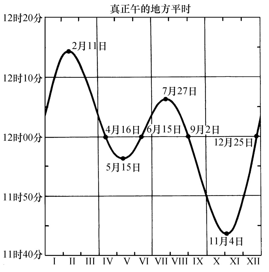 由上述可知,4月16日、6月15日、9月2日、12月25日四天内,地方民用时和日晷上的时刻是相同的;在2月11日,日晷比地方民用时慢14分,5月15日差不多快4分,7月27日又慢6分多。每天的时差数值都刊登在天文年历上。