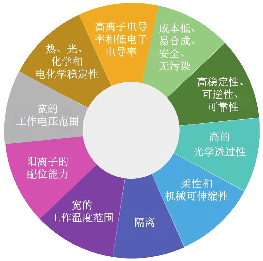 电致变色器件中聚合物电解质的基本要求及优势如下(图2.1)。
