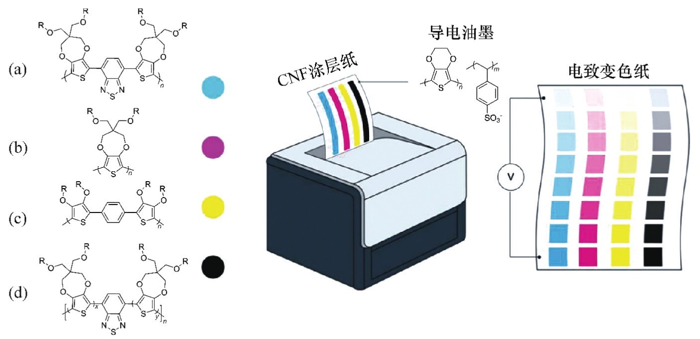 图2.2 彩色电致变色纸印刷示意图,包括CNF涂层纸基材和PEDOT∶PSS电极以及重复单元结构:蓝绿色彩色电致变色纸(ECP-Cyan)(a),品红色彩色电致变色纸(ECP-Magenta)(b),黄色彩色电致变色纸(ECP-Yellow)(c),黑色彩色电致变色纸(ECP-Black)(d)。R为乙基已基 [55]