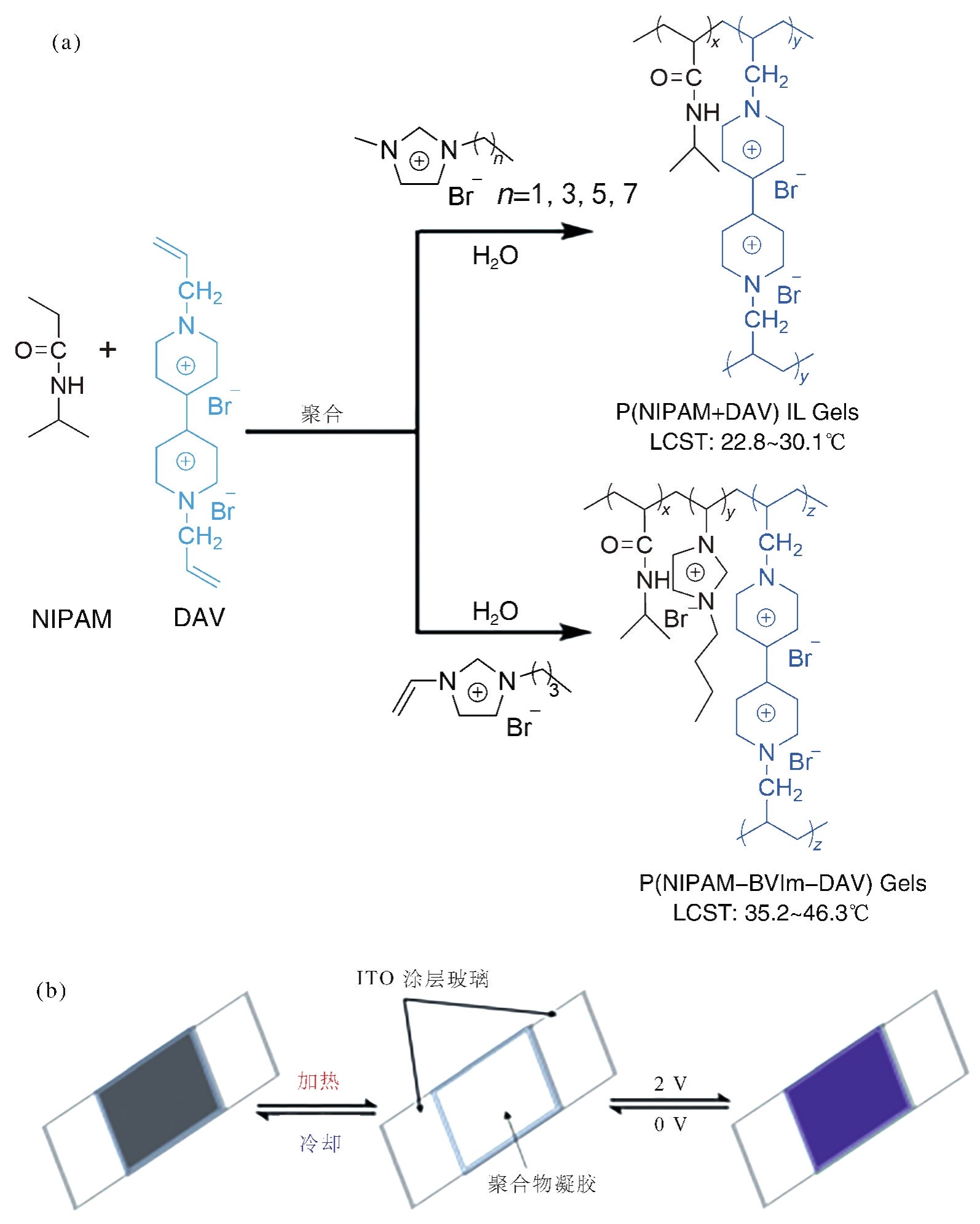 图2.8 P(NIPAM-DAV)IL凝胶和P(NIPAMBVIm-DAV)凝胶的一般合成路线(a),以及基于所制备的聚合物凝胶的热致变色和电致变色装置的原理图(b) [93]