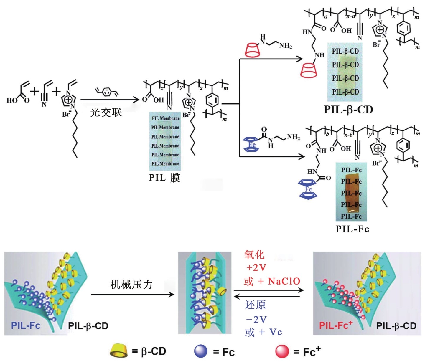 图2.11 PIL-β-CD和PIL-Fc膜的合成示意图,以及基于β-CD和Fc修饰的PIL膜表面的方法 [129]