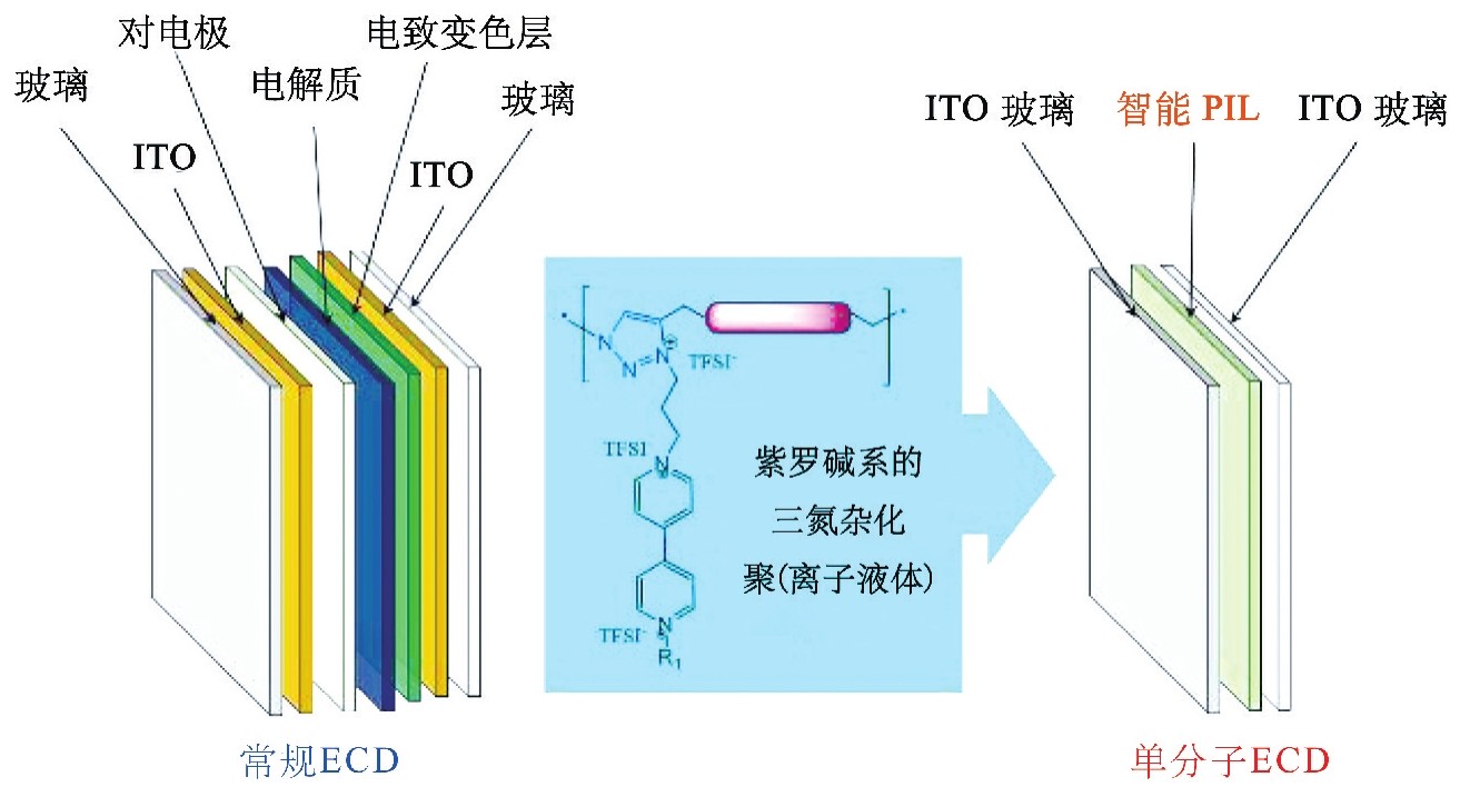 图2.10 一种可切换的单分子电致变色装置,它来自一种由紫罗碱系的三氮杂化聚(离子液体) [128]