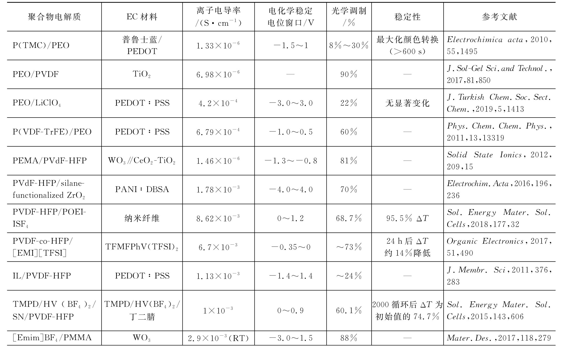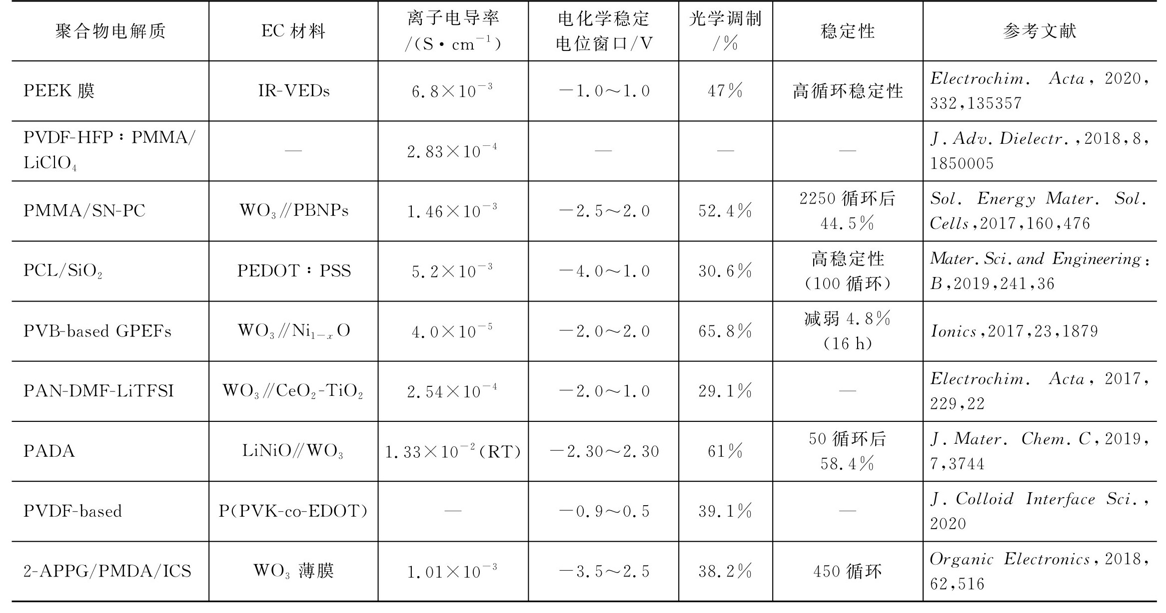 聚合物电解质的应用越来越广泛,其应用领域也在不断扩大。尽管基于锂离子的电解质已经商业化,如应用于波音787 梦幻客机下拉窗口阴影,法拉利575 Su-peramerica Flexity 2轻轨车辆的智能玻璃,但是,如不安全、很容易泄漏和不稳定的电化学性能的缺点限制了其进一步的发展和更广泛的应用。在本章中,我们对电致变色的应用要求进行了基本的了解,同时,综述了聚合物基电解质的最新进展,包括PEO/PVDF/PMMA凝胶聚合物、自愈聚合物、交联聚合物、陶瓷聚合物、离子液体聚合物和明胶聚合物电解质。复合聚合物电解质的应用已被认为是提高电解质性能的一种有前途的方法。