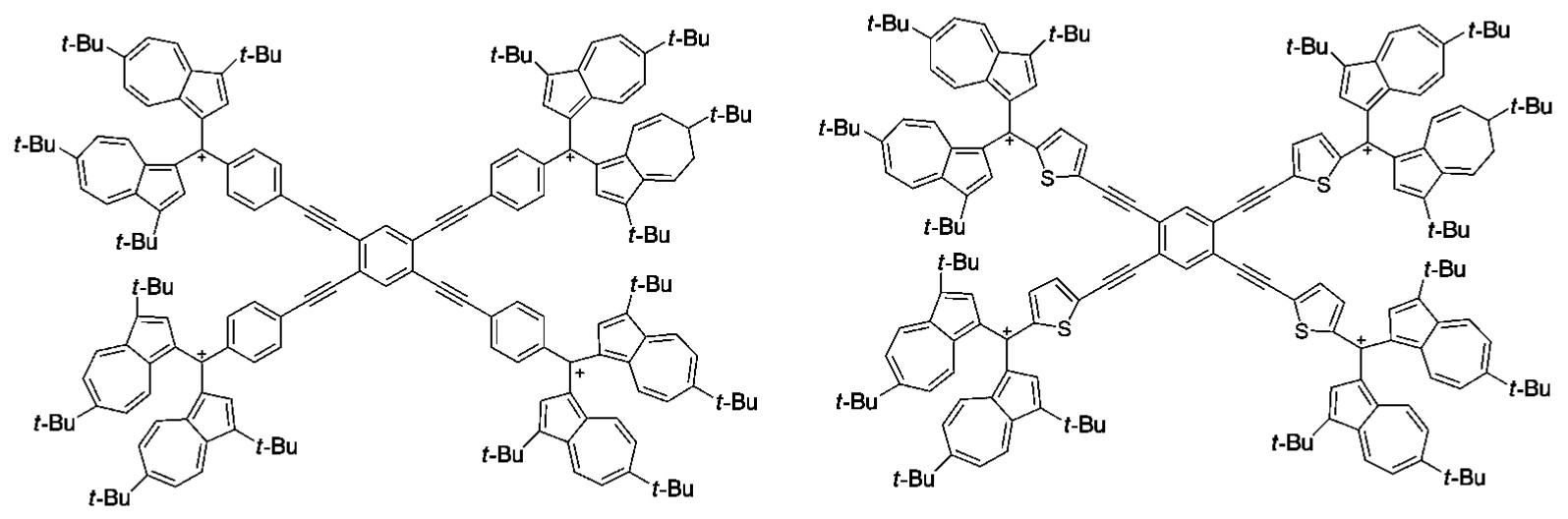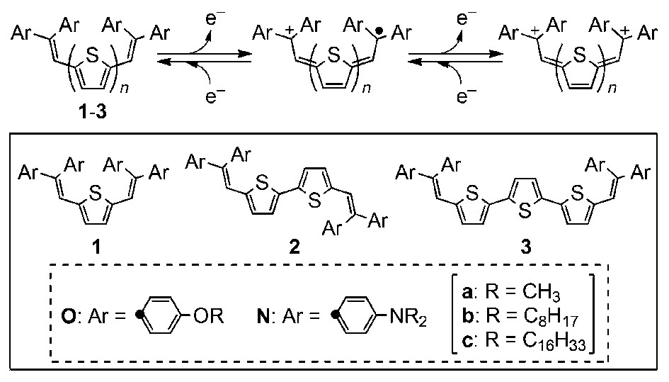 在2016年,Yusuke Ishigaki等人设计合成了一种新的紫罗精-菁类杂化型供电子体系,在这种结构当中,两个菁类基团的部分上各有两个4-甲氧基苯基,并能够产生两次可逆的单电子氧化,如图3.8所示。他们提出,噻吩的硫原子和芳基的ipso碳(Cipso)之间的短接触很可能与σ * (C—S)和π(Cipso)之间的电子相互作用有关,从而使得共面扩展几何结构的构象稳定性提高,适用于扩展π-系统的电子离域效果 [6] 。他们还提出,噻吩单元的数目可以作为一个变量,在不改变HOMO能级的情况下,修改和调整光谱性质(UV-Vis-NIR,FL)和LUMO能级。
