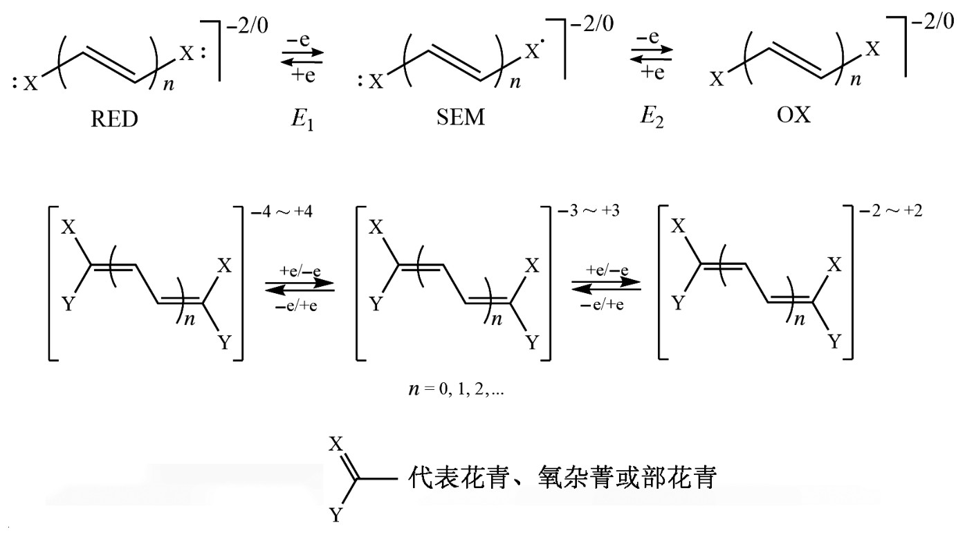 紫罗精-菁类杂化物是一种具有高颜色强度、高热力学稳定性的电致变色材料。在1999年,Siegfried Hünig等人第一次报道了几种紫罗兰/花青素(violene/anthocya-nin)杂化结构(图3.3),在这系列材料当中,花青素(anthocyanin)结构的功能主要是提供颜色显示,在外加电场作用下,分子的氧化水平可以变化为-4、-2、0、2、4,从而实现颜色的变化 [2]