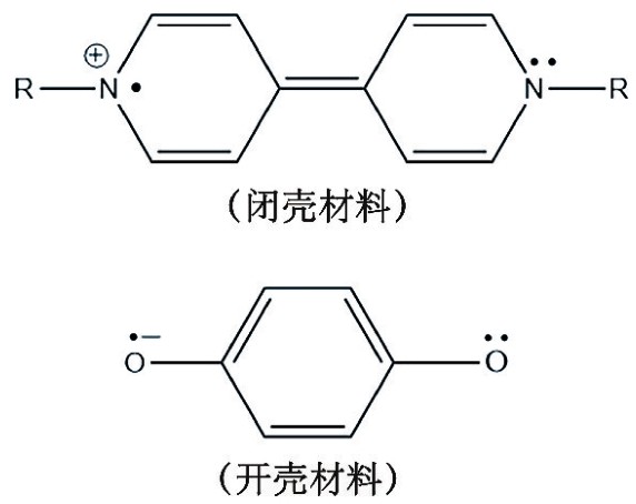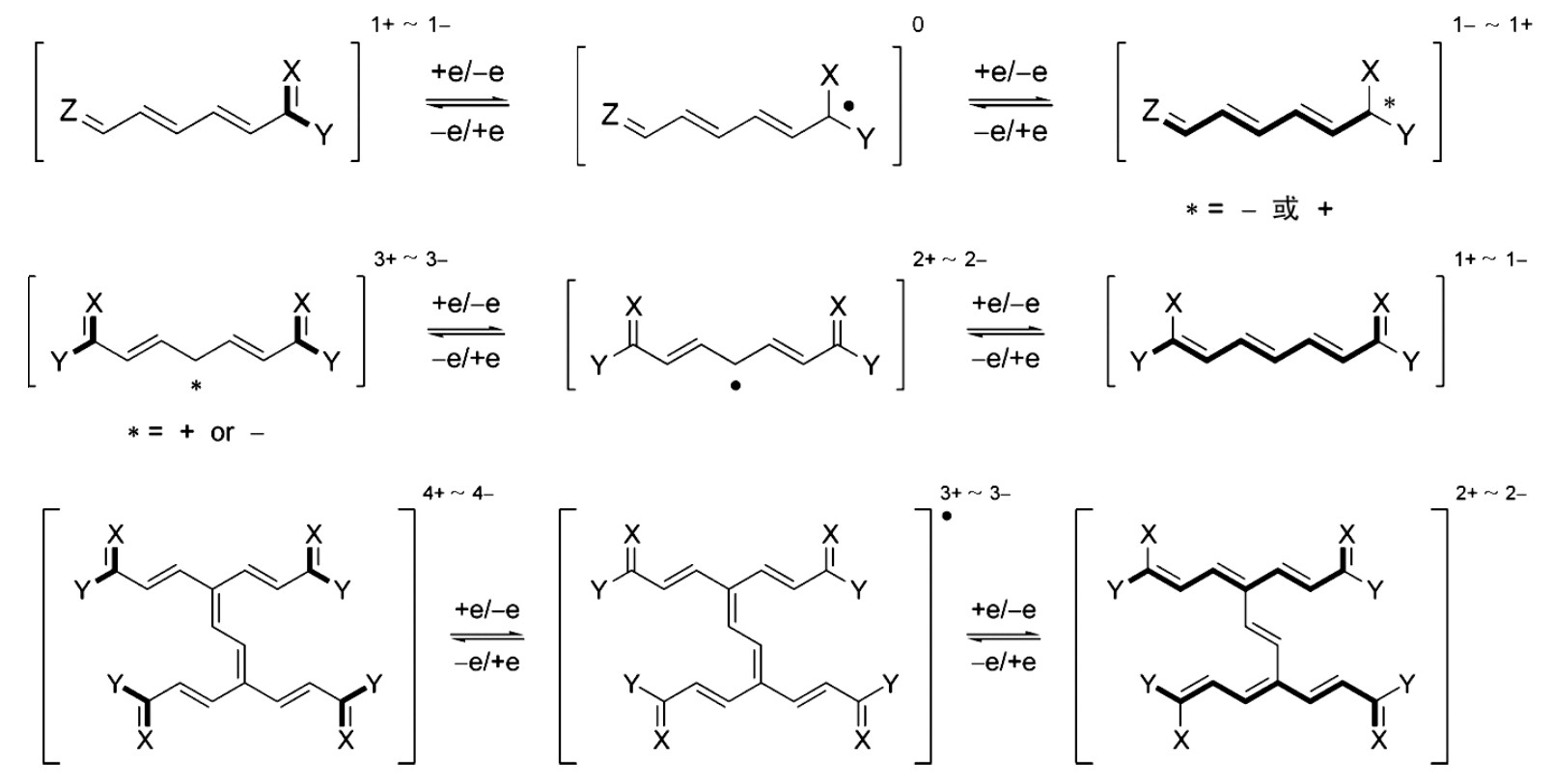 紫罗精-菁类杂化物分为闭壳材料(closed-shell)和开壳材料(opened-shell)。由于自由基反应通常与低活化能有关,故开壳层体系比类似结构的闭壳层体系分解速度更快,因此利用闭壳层分子的自由基结构能够提高材料的稳定性。在电场的作用下,此类材料的结构变化如图3.4所示。