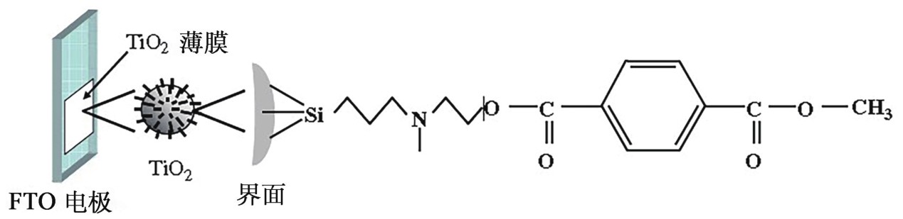 因此在2009年,Satomi Tanaka等人研究了邻苯二甲酸酯类衍生物(TP)的电致变色性能,通过电化学反应使材料由无色透明可逆地转变为三种颜色。但由于小分子酯类电致变色材料的稳定性实际上不如高分子材料,因此为了提高开路条件下的保色能力,他们制备了对苯二甲酸酯类衍生物/TiO 2 修饰电极(图3.23),方法是用邻苯二甲酸衍生物对TiO 2 进行改性 [8] 。实验中,对改性后的TiO 2 在溶液中进行物理分散溶解,是为了改善其在溶液中的化学性质。通过电化学还原,材料呈现出明亮的品红色并在530nm处有吸收峰。品红的颜色来源于DMT与邻苯二甲酸盐类似物的电化学反应产生的阴离子自由基(图3.24)。