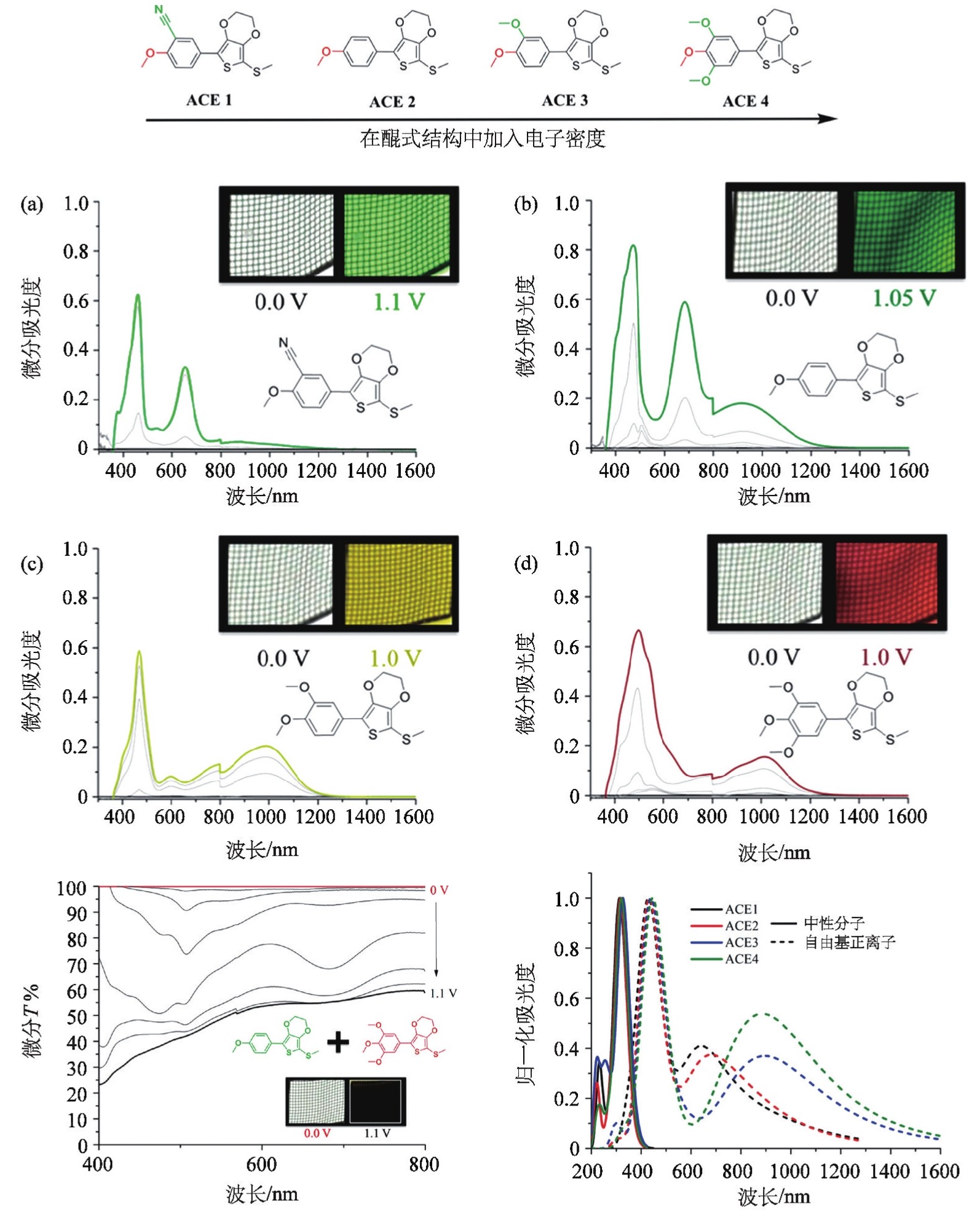 在有机电致变色的阳极着色领域中,对如何控制带电态的吸收存在着知识空白。2019年,Dylan T.Christiansen等人提出了共轭阳极着色电致变色分子设计的新策略(图3.28) [17] 。通过简单地调整取代基的位置和类型,可以实现对材料的颜色控制,而两种物质的混合物可以形成从无色到黑色的可逆变色效果。实验结果表明,自由基阳离子的能级可以由与发色团交叉共轭的富电子/缺电子部分控制,最终控制材料的光吸收和颜色。