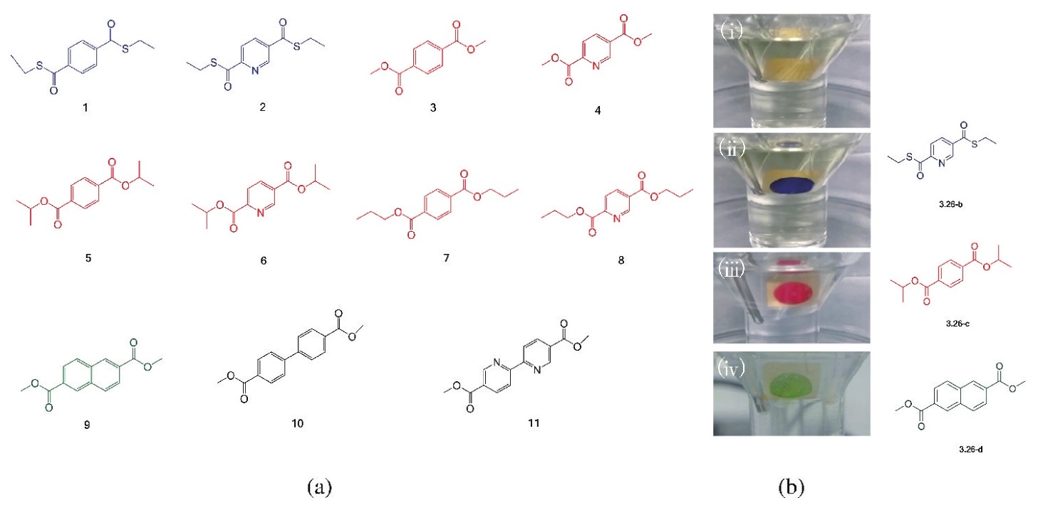事实上,对位二酯的阴离子自由基比邻位或间位取代形式更稳定,因为芳香环中的电子密度更高,导致—OR或—SH基团的亲核性更低,因此更不容易与水或氧分子反应。2014年,Xiuhui Xu等人研究了11种氧/硫二酯的电致变色性能,并筛选出三种原色材料(图3.25) [15]