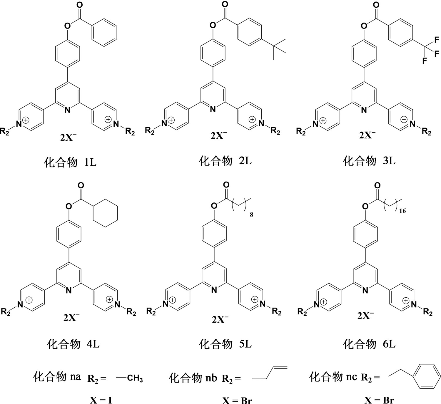 取代基通常对小分子电致变色材料有重要影响。2017年,Jun fei-Long等人研究了一系列吡啶类电致变色材料。通过在2,4-双(4-吡啶基)-4-苄基吡啶衍生物的苯环中引入酯类化合物,设计合成了一系列萜烯吡啶类化合物(图3.31) [19] 。研究发现,羧酸和氮取代基的种类对其电致变色性能有显著的影响。这些材料具有显色效率高、对比度合理、光存储性能好、氧化还原稳定性好等优点,具有广阔的应用前景。该系列吡啶的变色机理与紫精的变色机理相似。但紫精通常只有一种可逆的颜色变化,在电化学还原过程中会产生自由基阳离子。在液体介质中,由于自由基阳离子还原成中性分子的可逆性和稳定性差,一些吡啶只能观察到一种可逆的颜色变化。由此,Vin Uales等人报道了一种以紫精为基础,聚乙烯醇凝胶为聚电解质的双电致变色器件,其中聚电解质能稳定自由基阳离子还原到中性状态,为用这种材料制备双色电致变色器件提供了更好的策略。