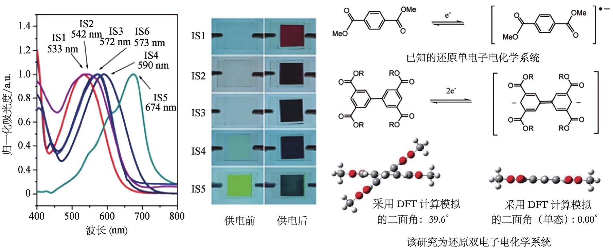和对苯二甲酸酯衍生物相似,间苯二甲酸衍生物是一种制备工艺简单、成本低廉的电致变色材料,但也存在稳定性差、循环次数低等缺点。因此,除了研究材料本身的性质外,提高材料着色能力的策略也成为研究的热点。