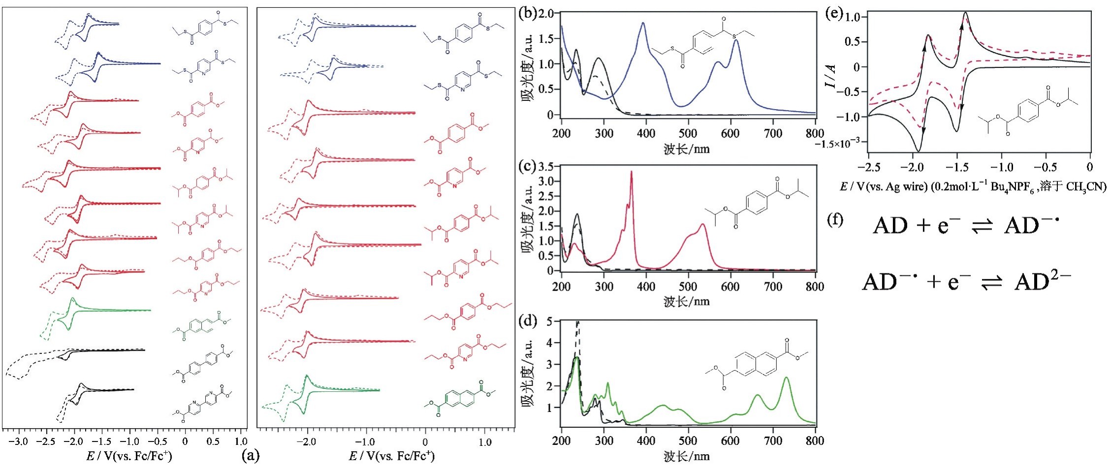 图3.26 二酯的循环伏安图(a):化介物2.5.9的原位电化学紫外可见光谓(b)~(d);用直径为1mm的平面GC电板以0.1V·s的归描建率记录的循环伏安图(c):类似结构电致弯色脂的压原反应(f)
