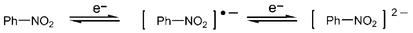 芳香族硝基化合物的阴离子自由基一直是一个非常重要的电化学研究课题,文章中对芳香族硝基化合物的还原机理进行了电化学表征,如图3.19 所示,硝基化合物的电化学过程由两个单电子还原过程组成。第一步还原物种是阴离子自由基,可以进一步还原形成二离子。考虑到硝基苯的多步还原过程,作者合成了5-硝基间苯二甲酸(M9)并对其电致变色性能进行了研究,如图3.17所示。循环伏安法测试显示了在-1.88、-2.71和-2.81V下的多步还原过程(相对于Ag/Ag + 参比电极)。如文献所述,当对硝基苯进行测试的情况下,在几乎相同的模式下观察到两个还原峰,其转移电位为-2.04和-3.08V(相对于Ag/Ag + ),这表明硝基苯的还原需要比M9更高的能量。值得注意的是,M9有两个额外的吸电子酯基。因此,M9的前两个还原峰可以归因于阴离子自由基和二离子的形成,这与硝基苯的原理相似。