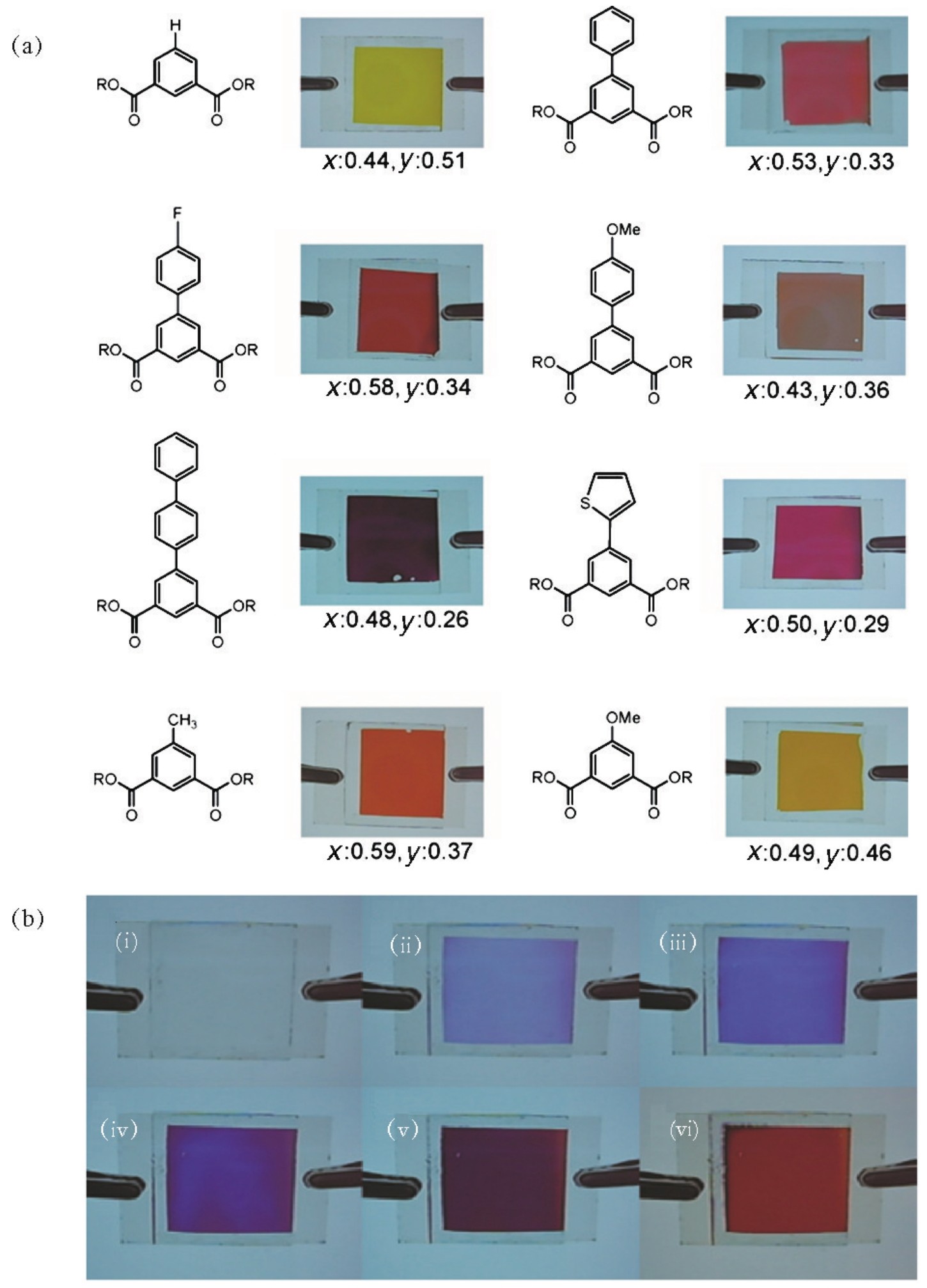 图3.20 (a)5-取代间苯二甲酸酯衍生物的电致变色(计算坐标见 CIE 色度图);(b)5-硝基间苯二甲酸酯衍生物在直流电压下的多色显示,在施加电压之前(i),第一步有色还原物产物(ii,iii)和第二步有色还原产物(iv)~(vi)