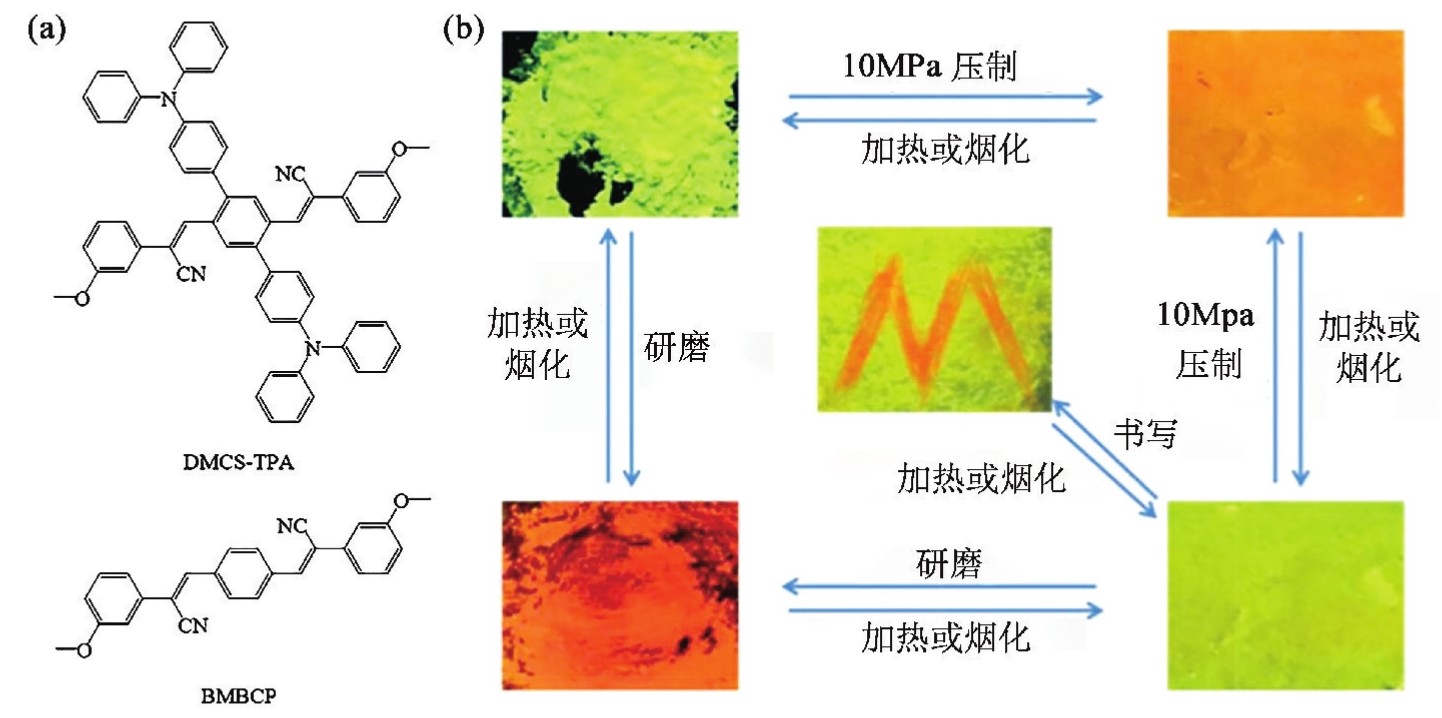 图3.47 DMCS-TPA和BMBCP的结构(a);DMCS-TPA在365nm紫外光下经不同处理后的照片(b)