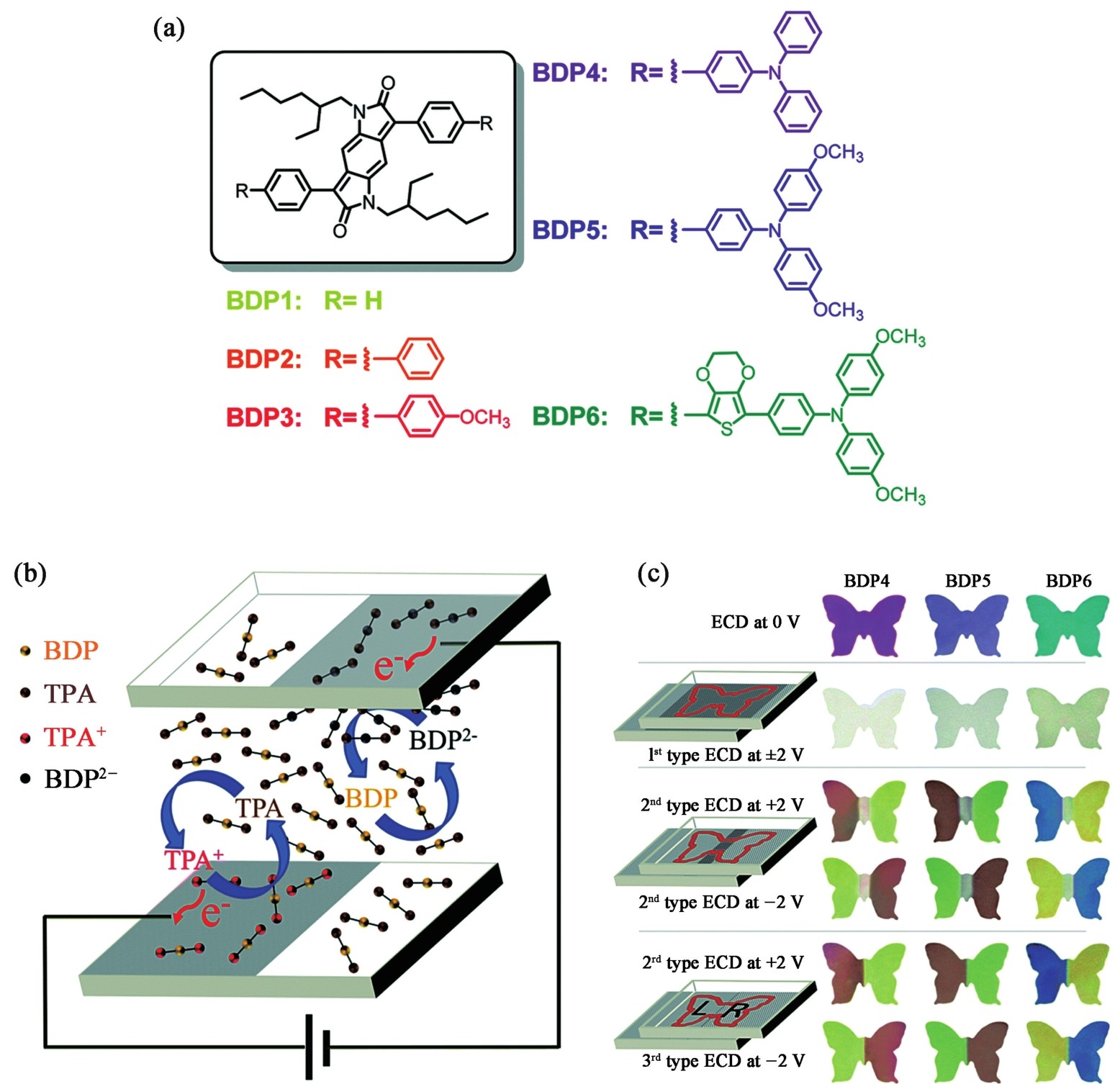 图3.48 双极性EC材料BDP1 ~BDP6 的化学结构(a);基于双极性BDP的第2 和第3 型ECD的工作原理(b);基于双极性BDP4、BDP5和BDP6的ECD在不同电位下的照片(c)