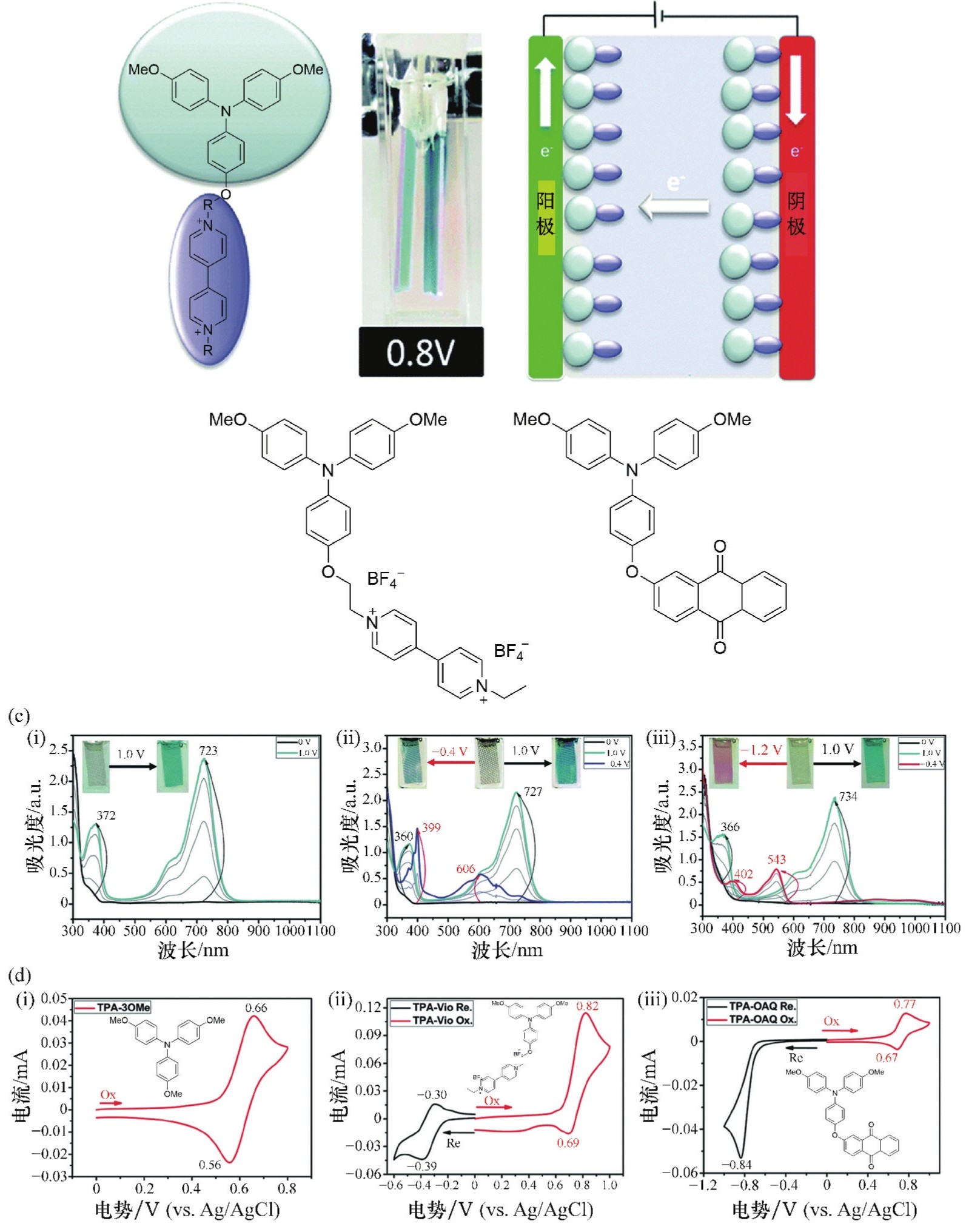 图3.49 双极性材料的颜色变化示意图(a);双极性TPA衍生物的结构(b);电致变色特性和相应的照片(c);极材料的CV图(d)