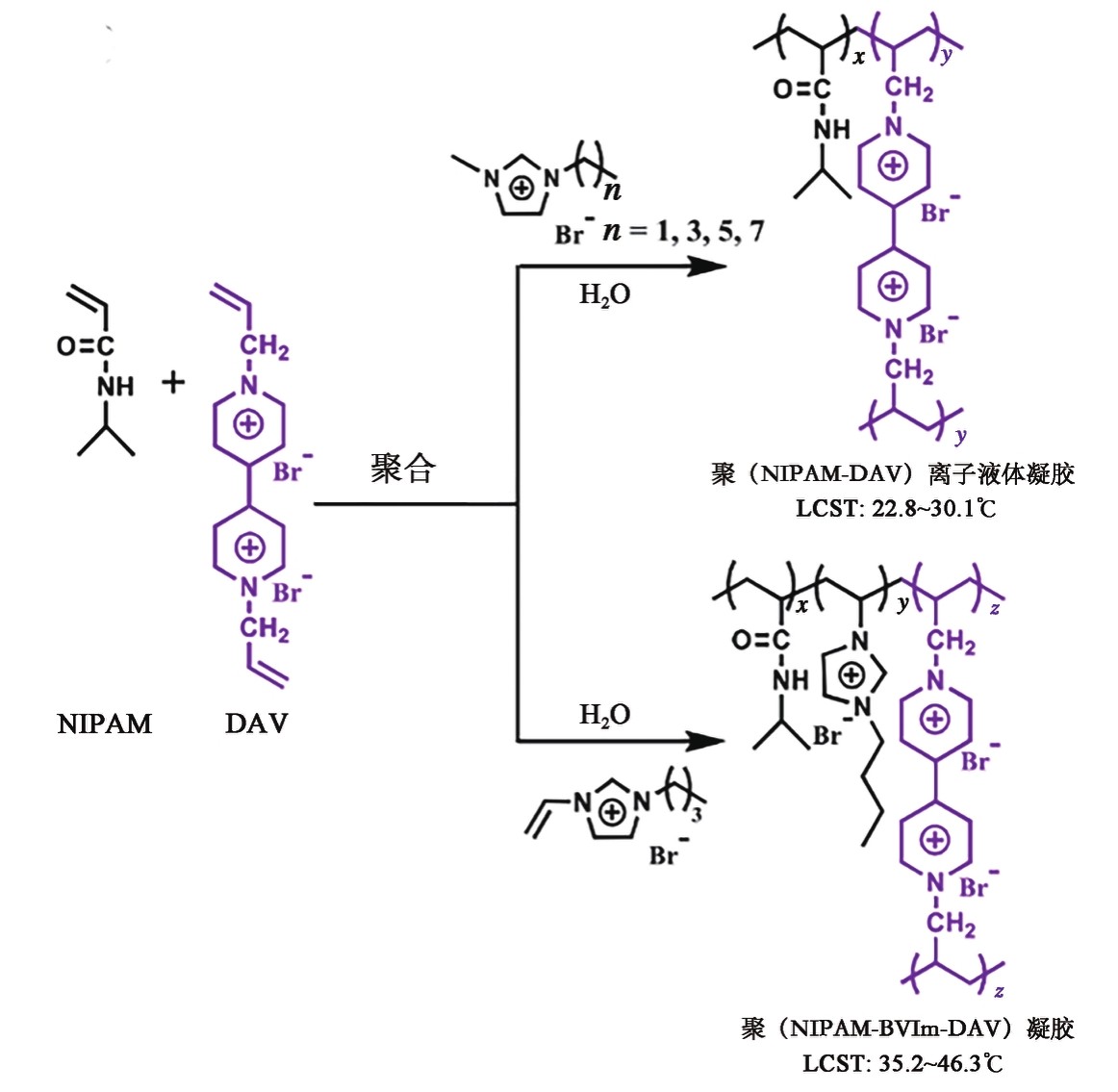 图4.18 聚(NIPAM-DAV)离子液体凝胶和聚(NIPAM-BVIm-DAV)凝胶的合成 [83]