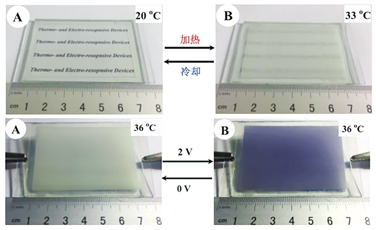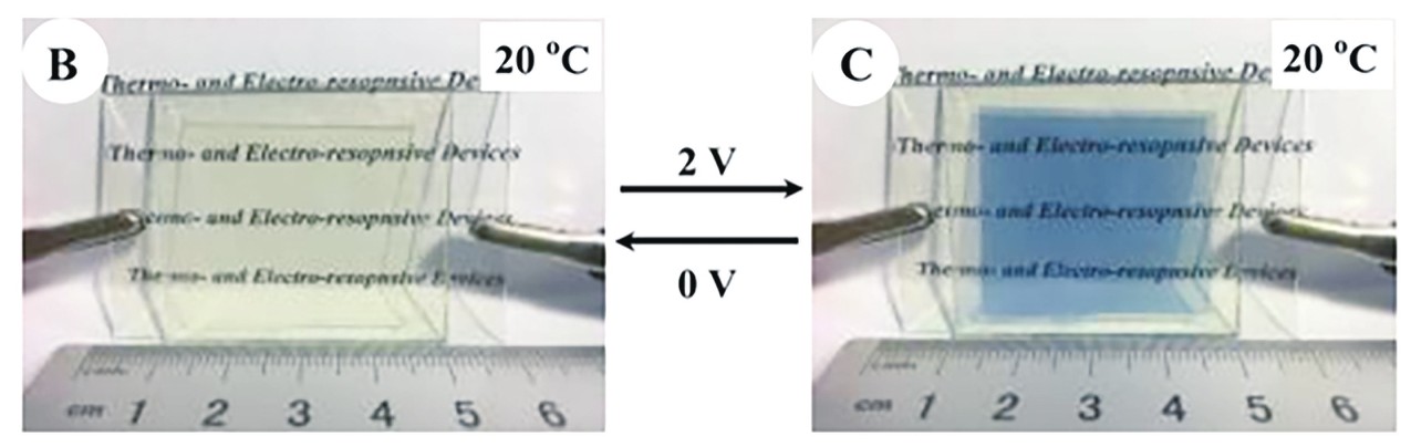 Jang等人 [81] 通过一锅聚合反应合成了含有聚(2-异丙基-2-恶唑啉)(PiPO x -v)的紫精,该PiPO x 被称为热敏聚合物。他们制作了一个简单的三明治结构ECD,结果表明,该ECD在不同电压和温度下可以呈现四种不同的颜色。