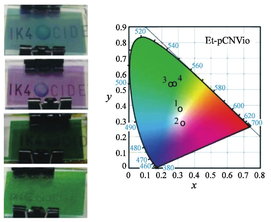 通常来讲,酯基一般也具有电致变色作用,并且它们通常呈现红色。研究人员通过将含酯类物质与紫精混合,合成了在不同电压下具有不同颜色的物质(图4.4)。该物质在2.0 V 时呈现红色,在 0.8V 时呈现蓝色,虽然它们的光学对比度低于43% [57]