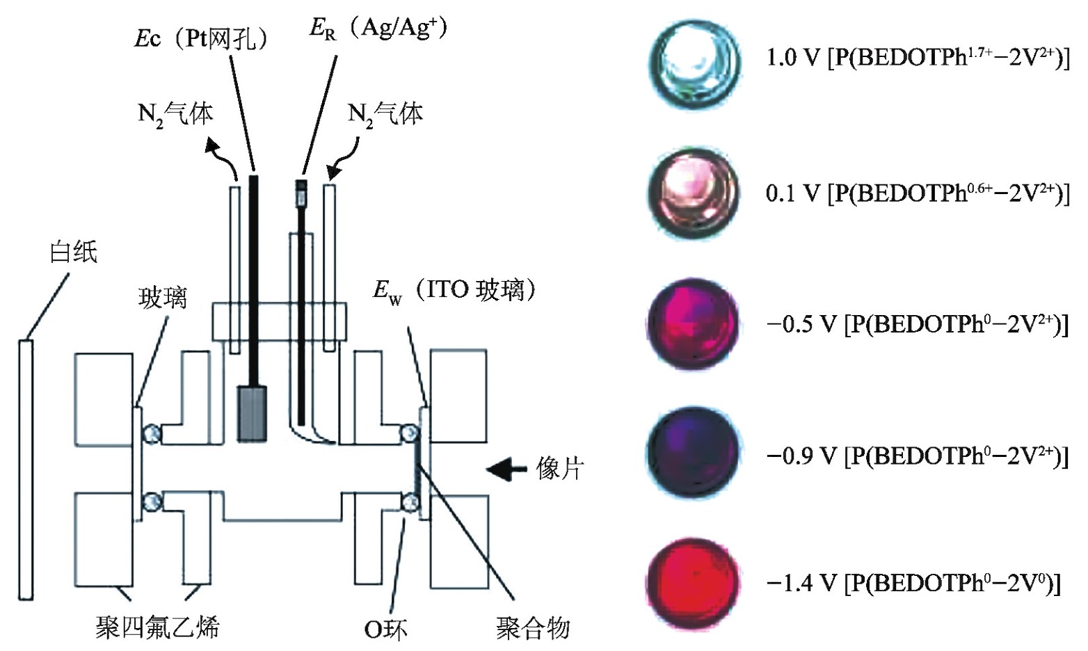 聚合(BEDOT-Ph)是很优秀的聚合物主链,可以使紫精分子呈现多种不同的颜色,由于它在不同电位下具有不同的EC颜色,并且它们的氧化还原电位不重叠,所得的紫精的导电聚合物表现出五种不同的颜色(图4.11),作为单种材料来讲算是比较罕见的 [62]