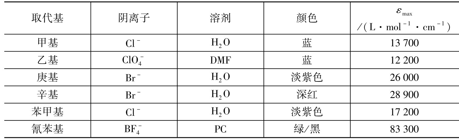 从上面的表4.2,我们可以得出一个粗略的结论。被简单烷基取代的紫罗兰色自由基阳离子通常显示为蓝紫色,而被芳基取代的自由基阳离子通常为绿色 [55] 。紫精二聚体的形成会使溶液颜色变为红色。