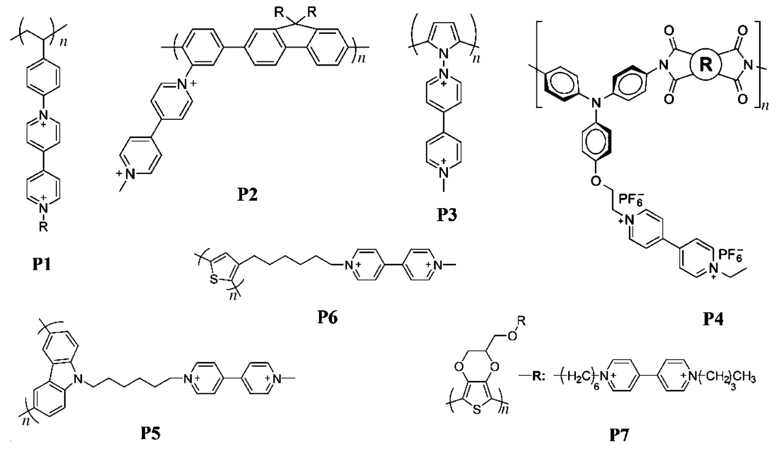 与主链聚紫精相比,通过合适的化学手段将紫精附着到导电聚合物主链上的情况更为普遍。值得注意的是,Zincke 反应是将紫精引入聚合物骨架的最常用方法 [70—71] 。如图4.14 所示,聚合物主链基本上是聚乙烯 [72—73] (P1),聚亚苯基 [71] (P2),聚吡咯 [70] (P3),聚酰亚胺 [74] (P4),聚咔唑 [75] (P5),聚噻吩及其衍生物 [76—77] (P6,P7)。