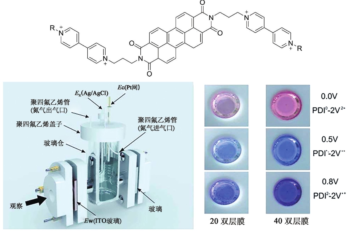 苝二酰亚胺是一种电致变色材料,在中性状态下呈红色,在半还原状态下呈蓝色,在还原状态下呈紫色。Moon 等 [59] 报导了基于PDI 的紫精的合成,他们合成了PDI-2V 2+ 多层膜,该膜表现出从红色到蓝色的多色电致变色现象,该多层膜是通过LBL方法制备的,该膜可以交替地用水基聚阴离子和聚阳离子涂层覆盖基材。