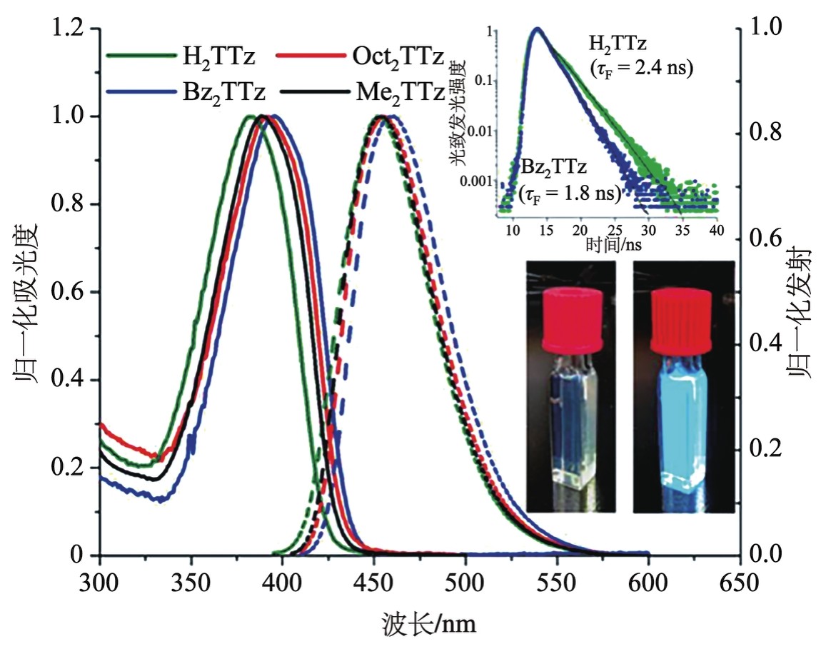 图4.7 H 2 TTz 2+ ,Me 2 TTz 2+ ,Oct 2 TTz 2+ 和Bz 2 TTz 2+ 的吸收和发射光谱