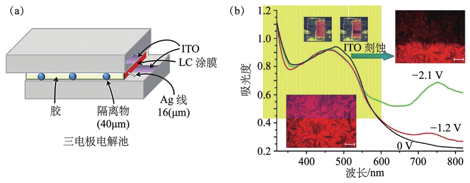 图4.12 三电极液晶盒(a);在不同电位下SmA相的吸收光谱和图片(b) [68]