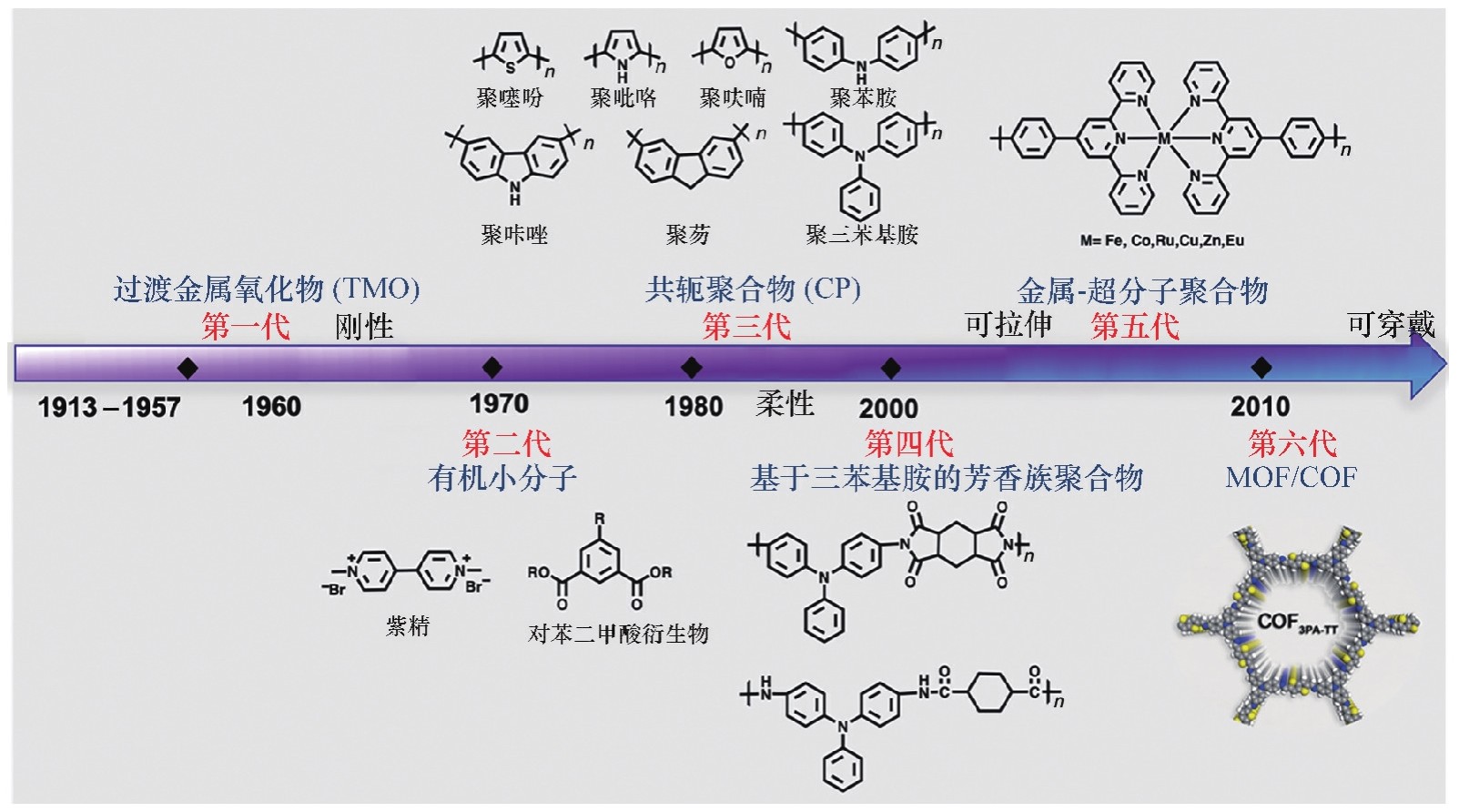 “电致变色”一词是由John R.Platt于1960年类比“热致变色”和“光致变色”而首次发明的 [7] 。然而,电致变色现象的发现可以追溯到19世纪。早在1815年,Berzelius就观察到在干燥氢气流下加热时纯三氧化钨(WO 3 )还原过程的颜色变化。从1913年到1957年,一些专利描述了基于WO 3 的电致变色器件的雏形 [8—9] 。因此,电致变色的起源可以认为是19—20世纪。从此之后,电致变色技术开始飞速发展,科学家们建立了许多种类的电致变色材料体系。如发展历程图所示(图1.3),我们总结了在长期发展过程中逐步建立的几代电致变色材料。