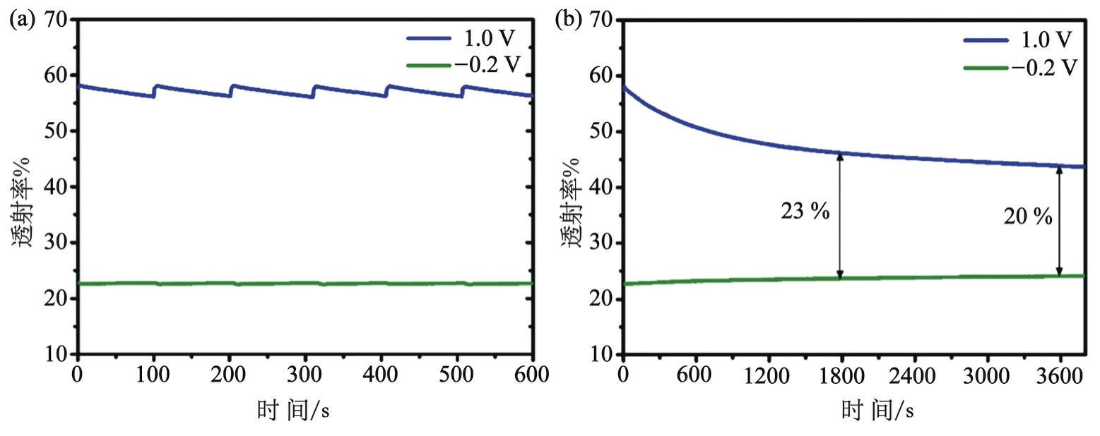 EC材料的光学或电致变色记忆效应(optical memory)可以定义为材料在消除外部偏压后保持其氧化还原/有色状态的倾向。通常,在薄膜状态的EC材料(例如共轭聚合物)中能较多观察到记忆效应,这些材料能很好地粘附在电极上,因此限制了电子的移动。相反,某些基于溶液状态的电致变色器件(例如紫精)会表现出自擦除效应,这意味着在没有施加电压的情况下,由于电子在这种类型的器件中自由扩散,有色状态迅速消失。记忆效应对于节能设备很有用,也可以用于数据存储。图1.9显示了光学记忆效应的测试,在形成开路状态600 s之前,通过施加2 s的电位脉冲来研究短期存储;同时监测423nm处的透射率变化[图1.9(a)]。然后通过施加2s的电位并去除1h的偏压来研究长期记忆效应[图1.9(b)],在没有施加电压的情况下,EC共轭聚合物仍然很好地保持了初始透射率对比,显示出良好的光学记忆效应。