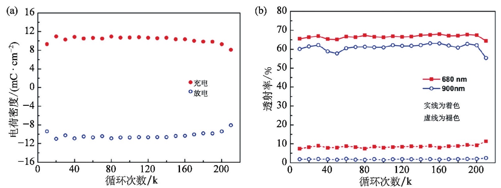 在大多数的实验室研究中,研究人员记录了EC材料的电化学循环稳定性,即在没有明显性能衰退情况下的最大循环次数。引起不可逆氧化还原的原因主要是EC材料与电解质中的水或氧气发生副反应。通常,电化学稳定性测试的方法为在电化学循环10 4 ~10 6 圈下记录的电荷密度Q d 的变化,如图1.10(a)所示,掺杂Ti的V 2 O 5 EC膜的电荷密度在循环了2 ×10 5 圈后仍然没有变化,展现了较好的电化学稳定性 [22] 。同时,在连续循环过程中特定波长处的透射率变化对于描述EC材料的稳定性也很重要,例如图1.10(b),ECD的透射率在2×10 5 个周期内保持稳定。实际上,经过多次循环后的着色效率的变化也可用于评估EC材料的长期稳定性,因为它既包含透射率信息,又包含电荷密度信息。